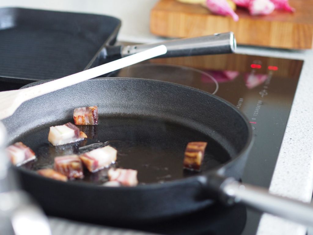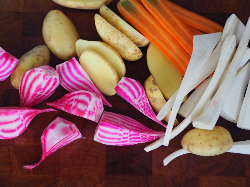 Frühstücksspeck würfeln, Rüben, Sellerie, Karotten, Petersilwurzen, Kartoffel parieren und vierteln, Fasern der Mangoldrippen entfernen, Petersilie entstielen. Speckstücke in einer Pfanne mit Olivenöl braten, Kartoffeln und Karotten hinzugeben und schmoren lassen, etwas später das restliche Gemüse dazu geben. Bei schwacher Hitze schmoren lassen, mit Rinderbrühe aufgießen und zugedeckt bei ganz leichter Hitze schmoren lassen, das Gemüse muss auf der Zunge zergehen.