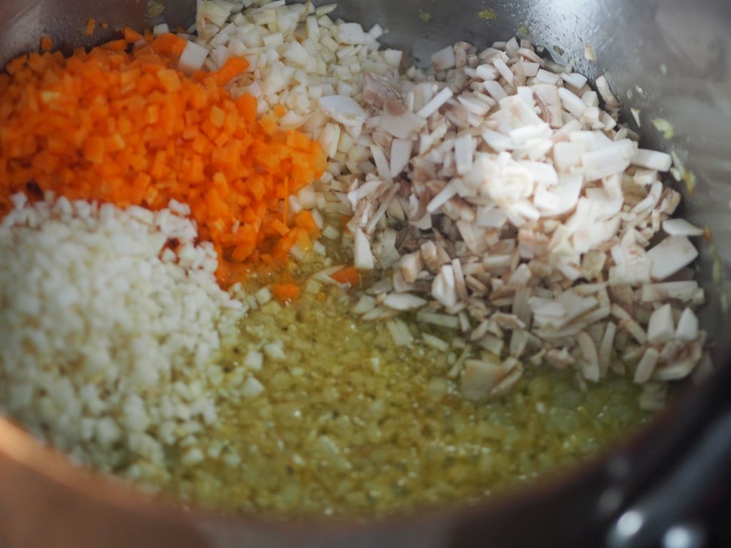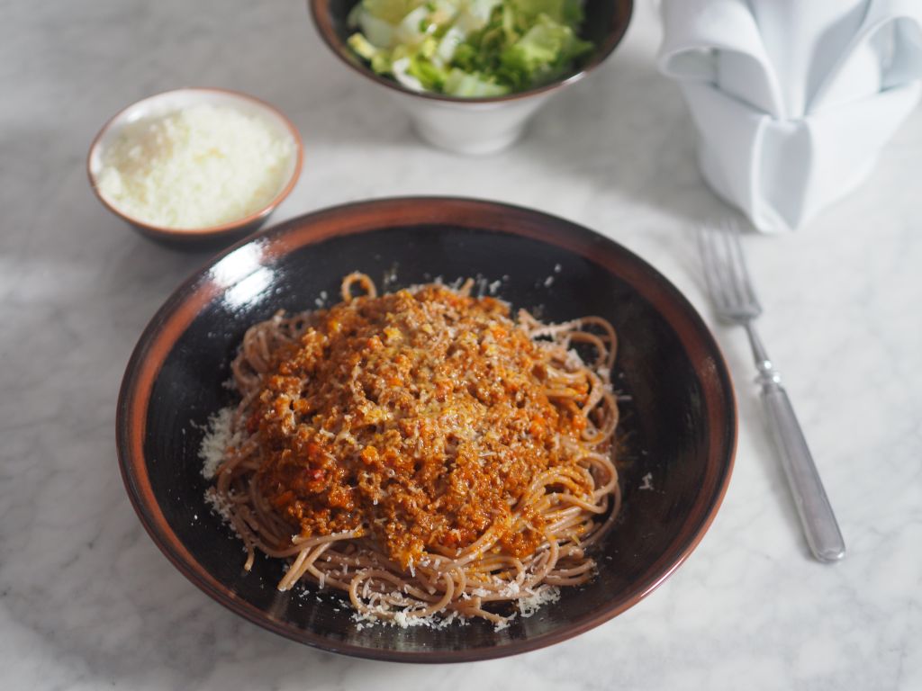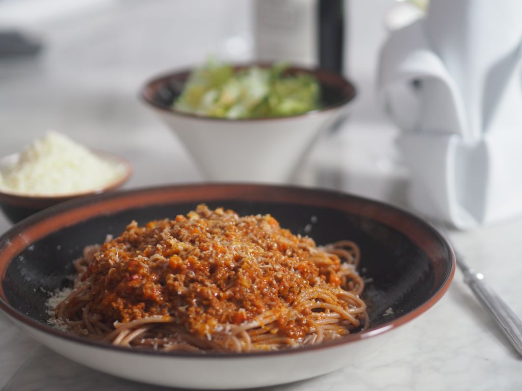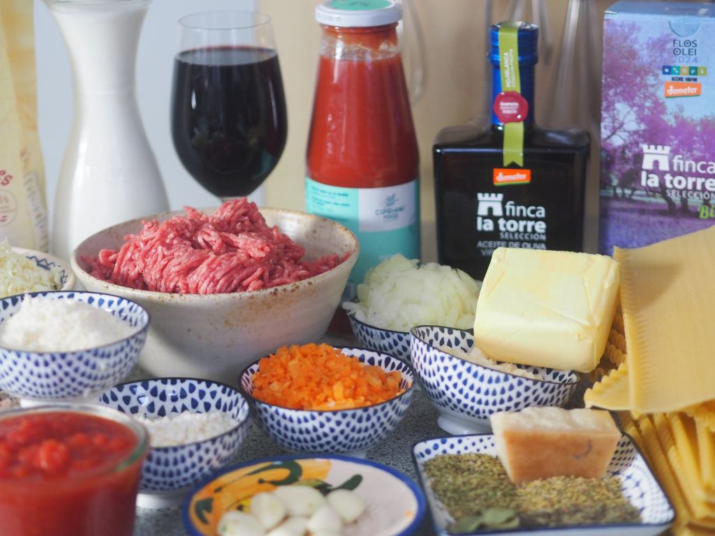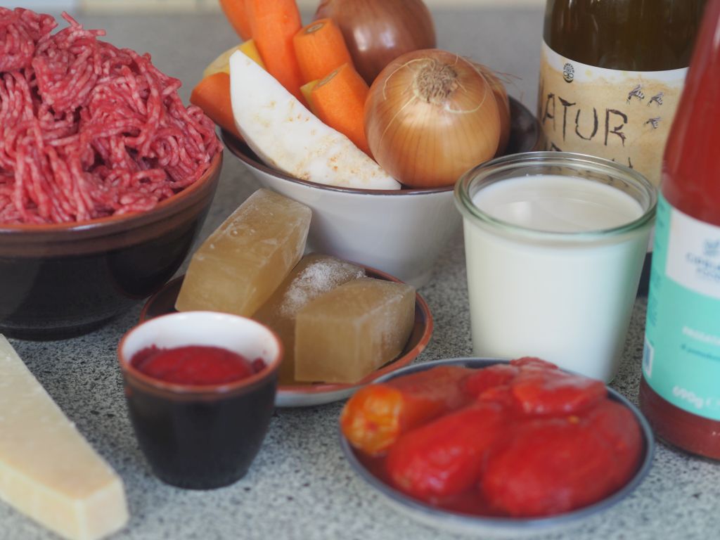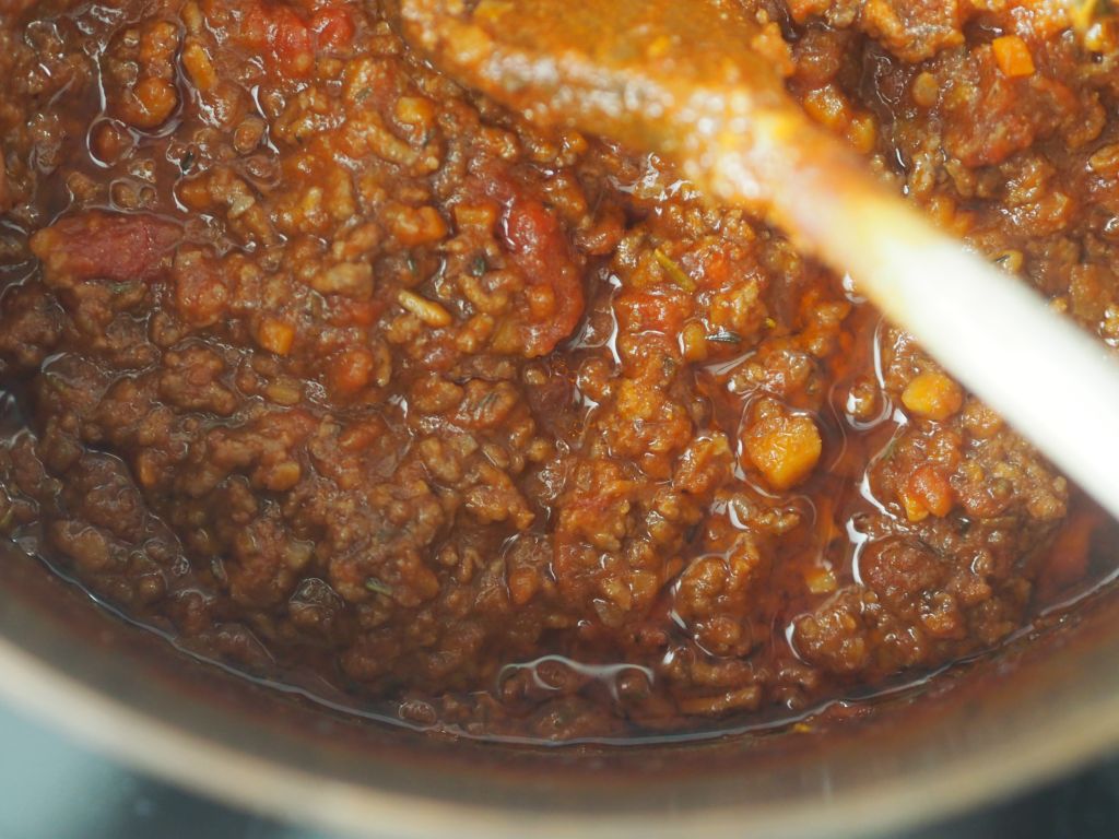 Für 2 Portionen: 1 mittelgroße Zwiebel, Olivenöl, 4 Knoblauchzehen, 1 EL Agavendicksaft, 1 EL Sherry-Essig, 400 ml pürierte Tomaten, Oregano und Basilikum, Salz, 2 Paar Wiener Würstel, Parmesan