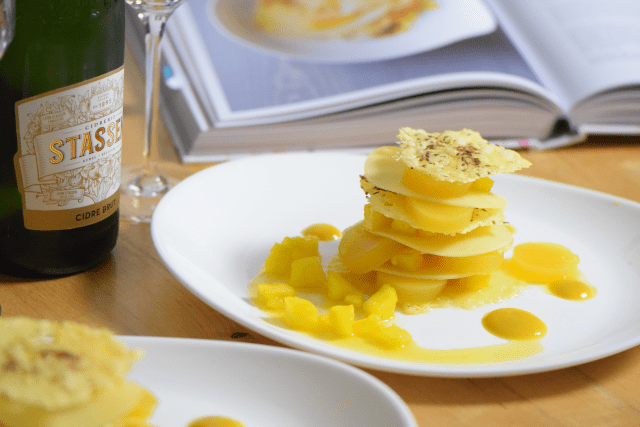 Da könnte man glatt zum Schweizer werden! Schon wieder ein Spitzenrezept aus der Schweiz von Tanja Grandits! Dieses Mal gibt es auch eine Getränkeempfehlung: Cidrerie Stassen, Aubel, Belgien. Dieser fruchtige, mit Leichtigkeit perlende Cidre passt perfekt zu dieser Komposition in Gelb. Wenn man sich das so anschaut, kommt man erst drauf, wieviele Lebensmittel es gibt, die gelb sind. Ananas und Käse sind gelb. Zitronen sind gelb, Honig ist gelb und Senf, der bei Tanja Grandits natürlich nicht fehlen darf, ist auch gelb. Eine ganze Welt in Gelb. Gewürze inklusive. Selbstverständlich passt auch geschmacklich alles zusammen.