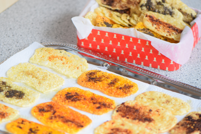 Käsescheiben mit Gewürzen bestreuen und im Backrohr ein paar Minuten braten. Sehr einfach diese selbstgemachten Knabbereien für später am Abend. Auch Knäckebrot kann man durch Gewürze so veredeln. Knusprig und geschmackvoll.