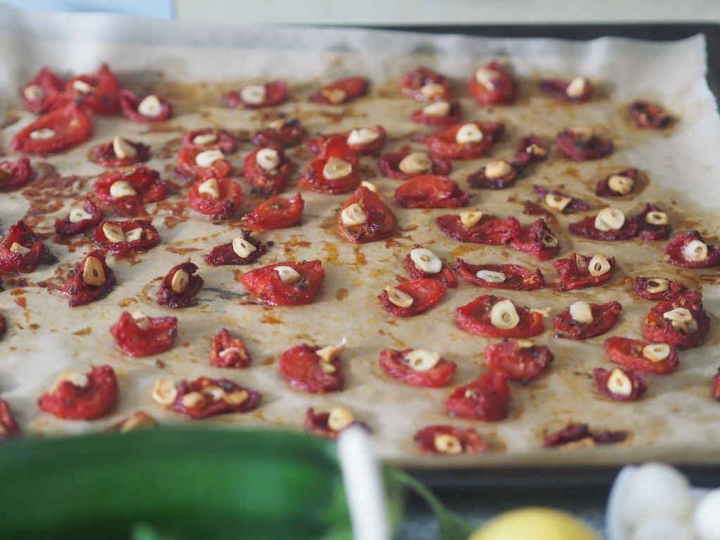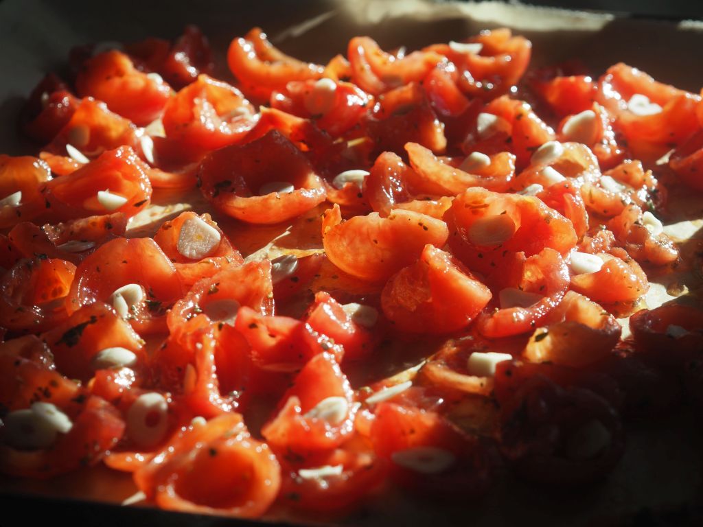 Natürlich kann man getrocknete Tomaten kaufen. Jedoch man bringt sich um den Geruch, der durch das Haus strömt, wenn man die Tomaten selbst im Ofen trocknet, mit Olivenöl und einem kleinen Stück Knoblauch obendrauf. Und gehacktem Thymian und Rosmarin. Dieser Geruch steigt einem in die Nase, und regt Geist und Gemüt an. Nur durch diesen Geruch, man hat noch nichts gegessen, umfaßt einen eine Glückseligkeit… man fühlt sich wohl ums Herz wie im Paradies. So kommt noch etwas hinzu, das unser Wohlbefinden steigert, über die gesunde Ernährung hinaus, etwas nicht Berechenbares, eine Komponente, die ausschlaggebend ist, jenseits aller Ernährungsberatung.