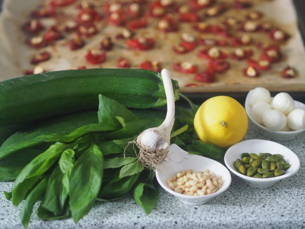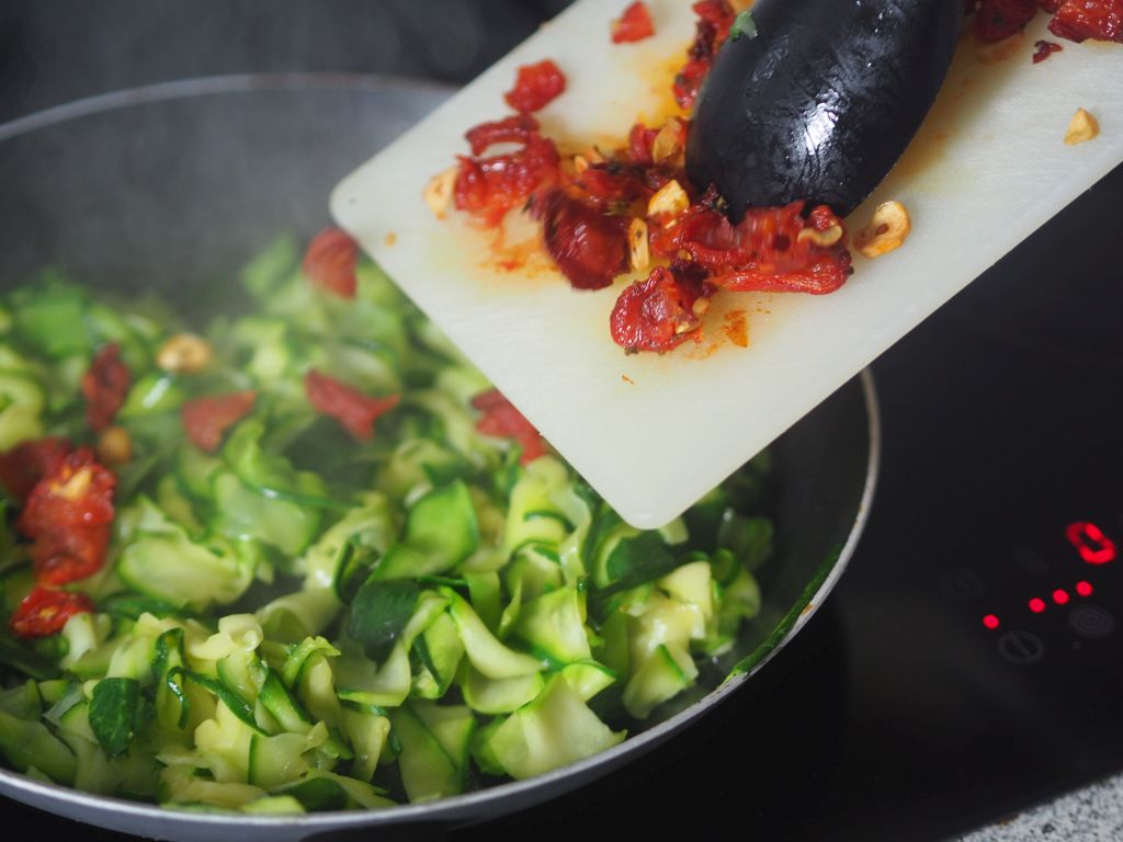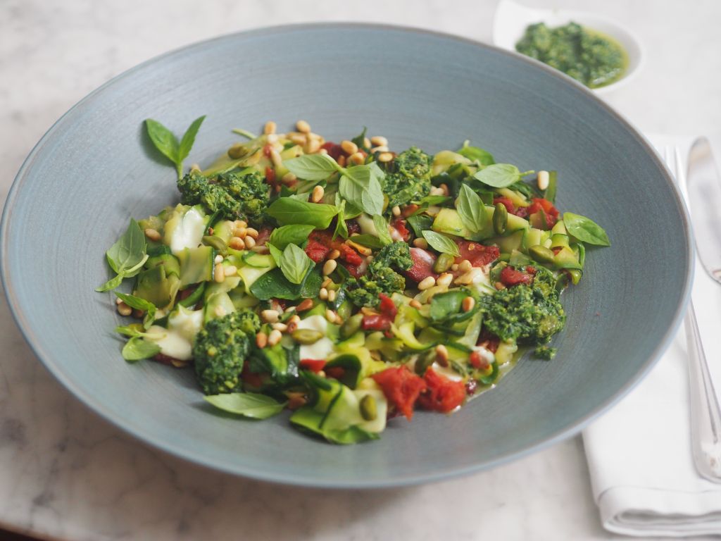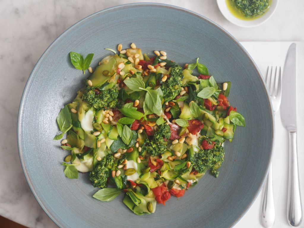 Zucchini-Bandnudeln mit Pesto, getrocknete Tomaten und Mozzarella (Abendessen)