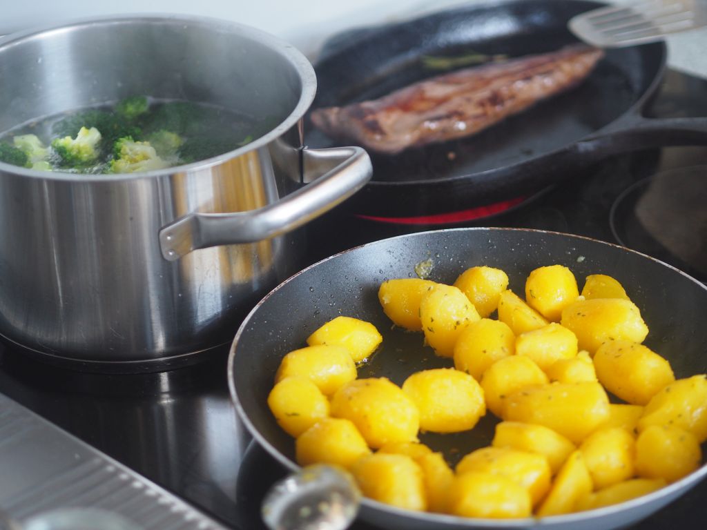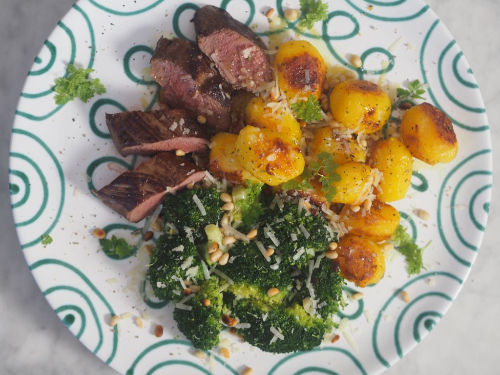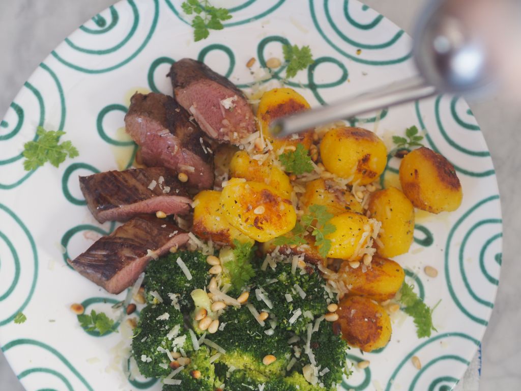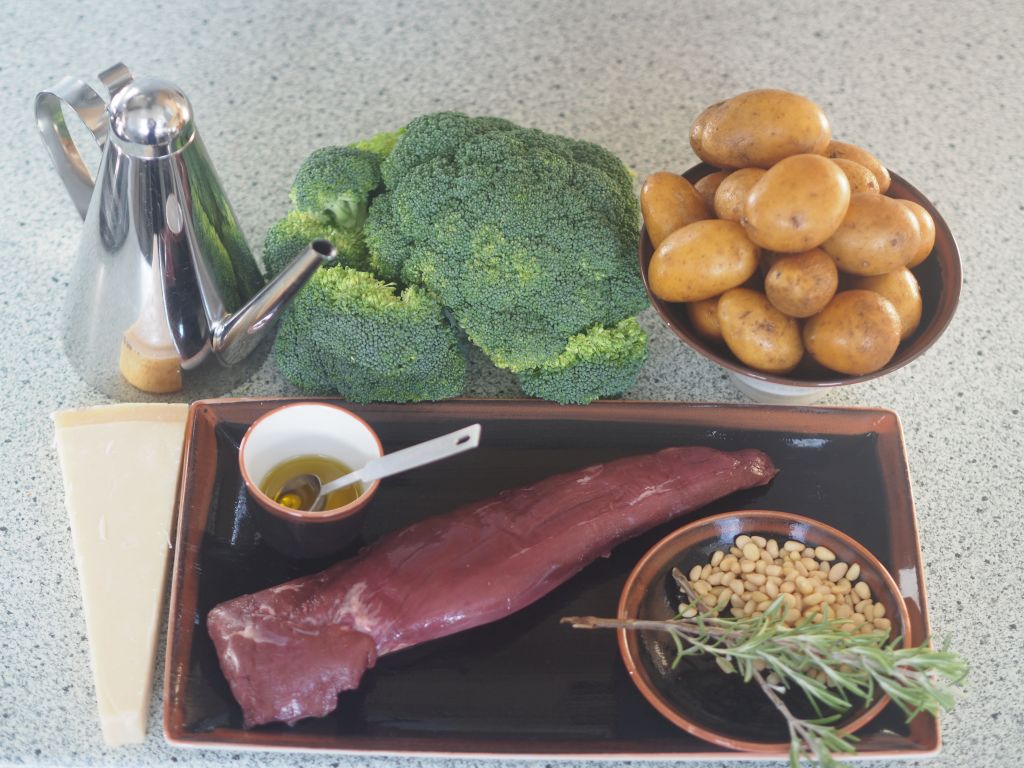Parmesankartoffel mit Wildschweinfilet und Pinienkerne mit Rosmarin und Brokkoli (Mittagessen)