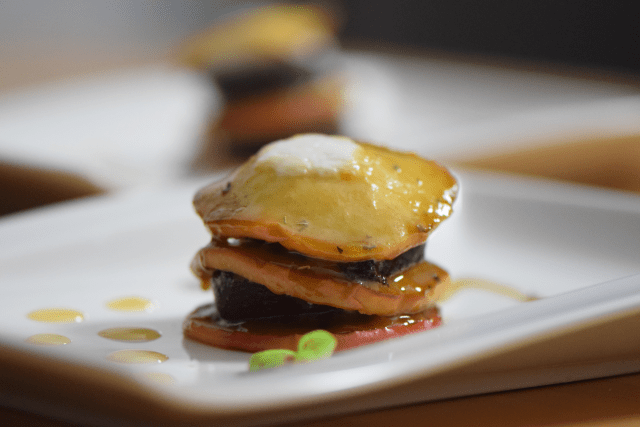 Blutwurst-Apfel-Stapel garniert mit Blutampfer. Apfelscheiben werden mit Ziegenkäse abwechselnd in mehreren Schichten aufgestapelt, dazwischen Blutwurstscheiben. Die Stäpl werden mit einer Spezial-Honig-Vinaigrette übergoßen und dann kommen sie für ein paar Minuten ins Backrohr.
