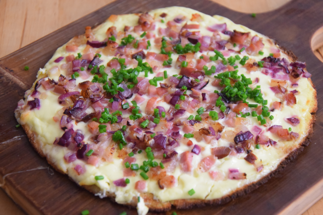Dieser Flammkuchen wird aus einem Teig mit Blumenkohl und Kokosmehl gemacht, das entspricht wohl nicht so der traditionellen Art. Auch der Belag mit Makrele, Avocados, Tomaten und Kräutern ist eher wenig gebräuchlich. Aber die Crème fraîche ist doch dabei wie bei einem Pfälzer Flammkuchen!