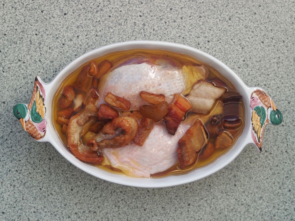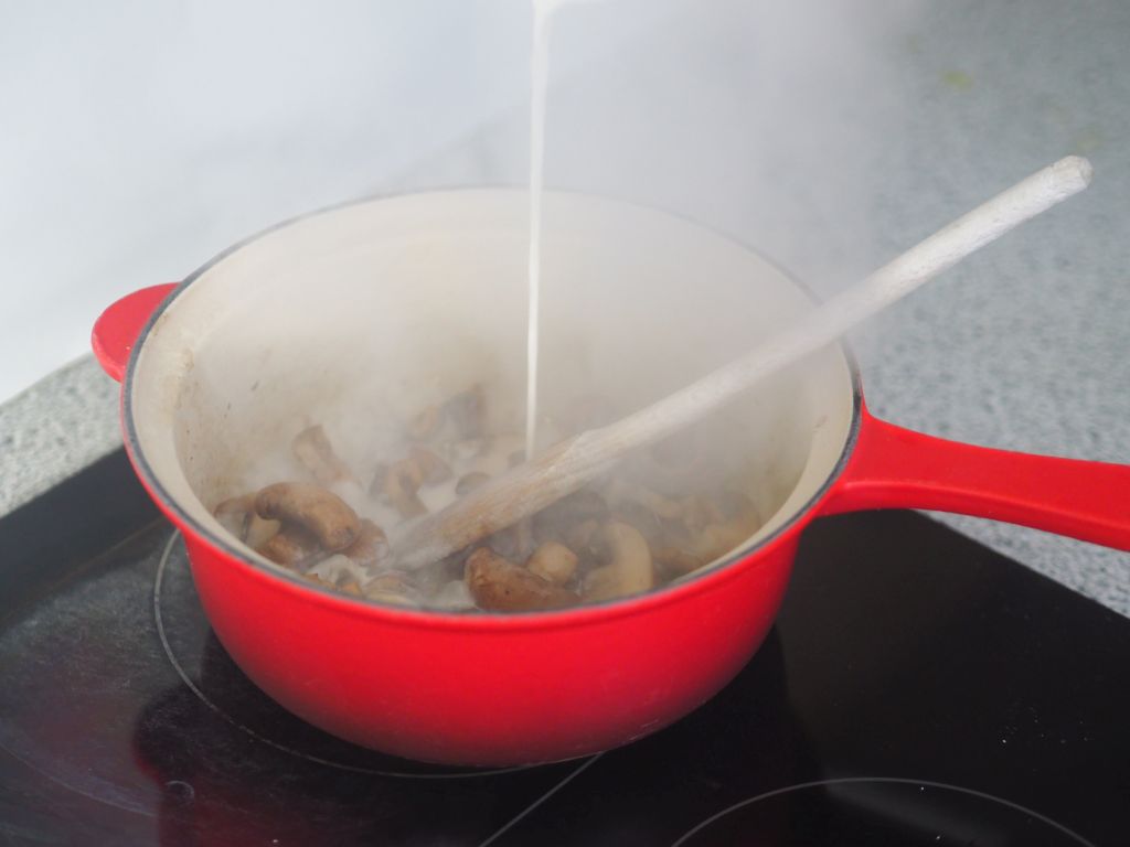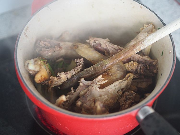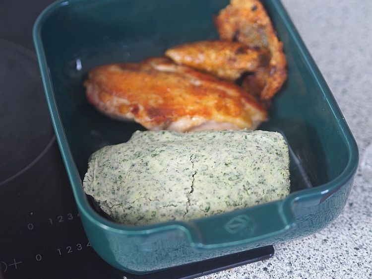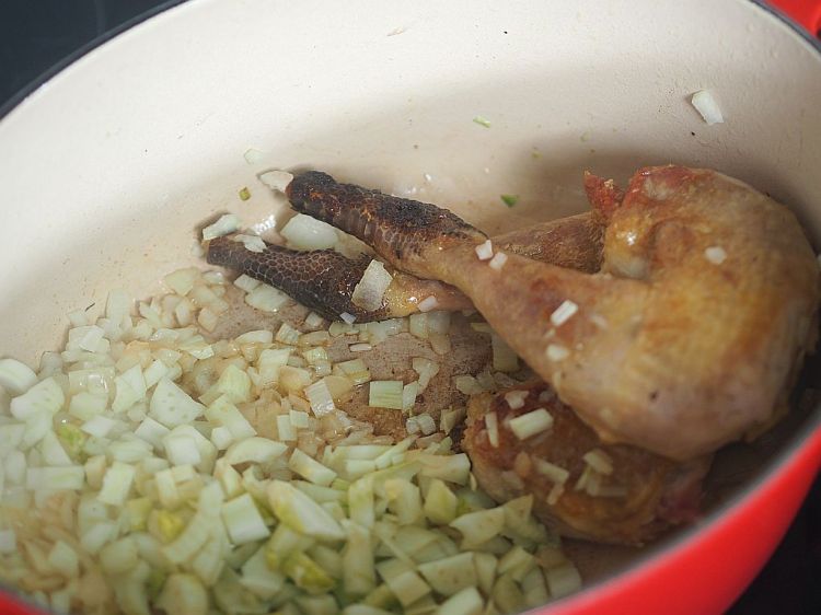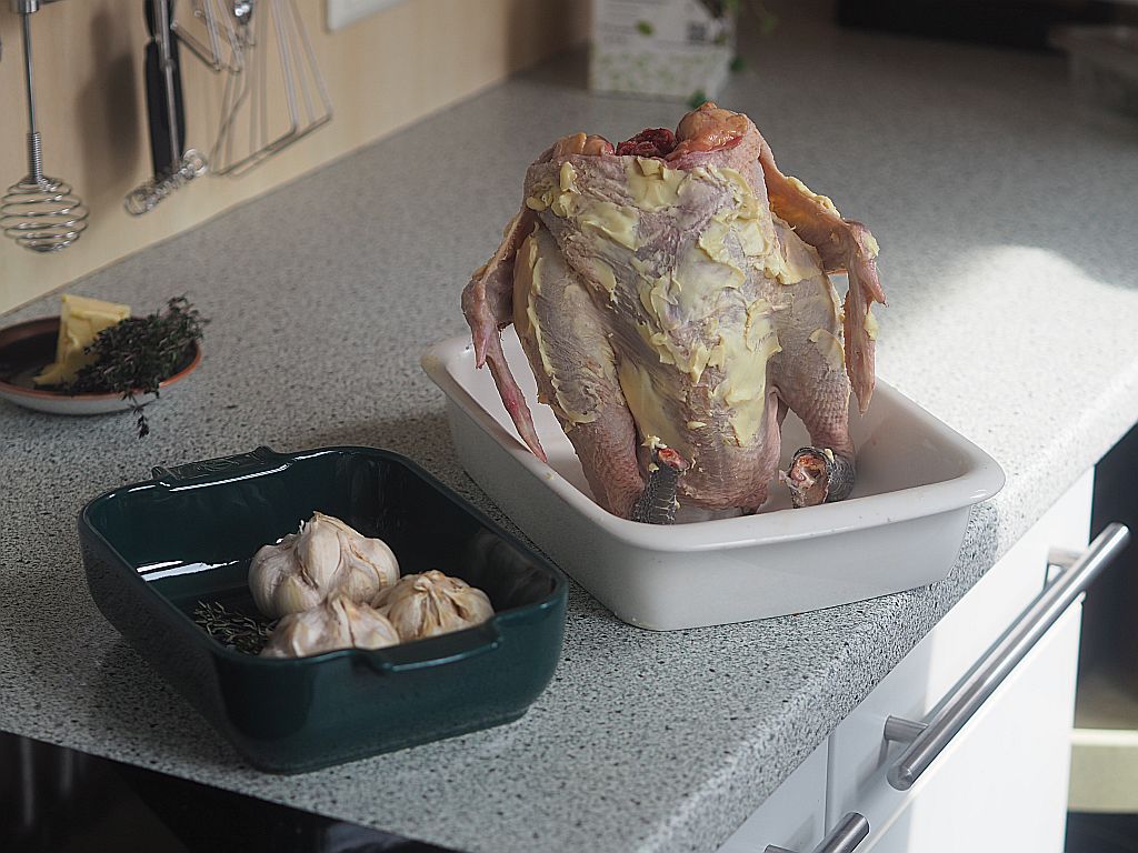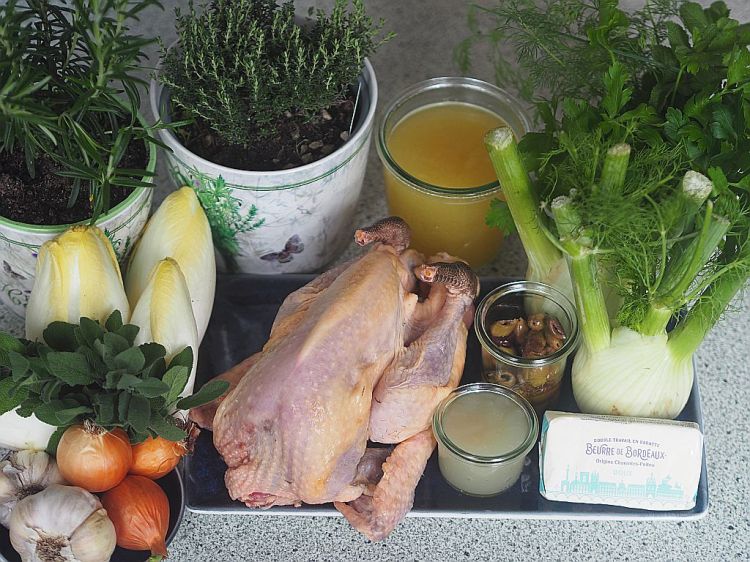Bressehuhn mit andren Pilzen zu kombinieren, ist unvorstellbar. Viele Rezepte gibt es mit Morcheln. In der „Kulinarischen Enzyklopädie“ aus der Reihe „Grand Livre de Cuisine“ von Alain Ducasse gibt es jede Menge Rezepte für Bressehuhn, mit Zutaten, deren wir nicht (mehr) habhaft werden: mit Trüffeln, Flußkrebsen und eben mit Morcheln. Ein Rezept fanden wir, das ohne all diesen Zutaten auskommt. Das Huhn wäre zu pochieren, doch die Hofköchin hätte es mangels Nadel nicht wasserdicht dressieren können. Dabei – so stelle ich mir vor – wäre genau diese Art der sanften Zubereitung am besten: in Hühnerbrühe mit Kochwein und etwas Trüffeljus, der den Eigengeschmack hervorhebt. Aber ganz ohne Gewürze.