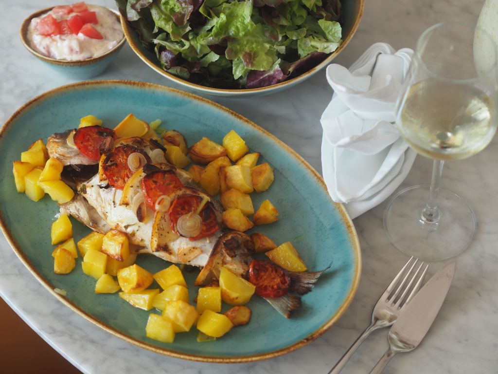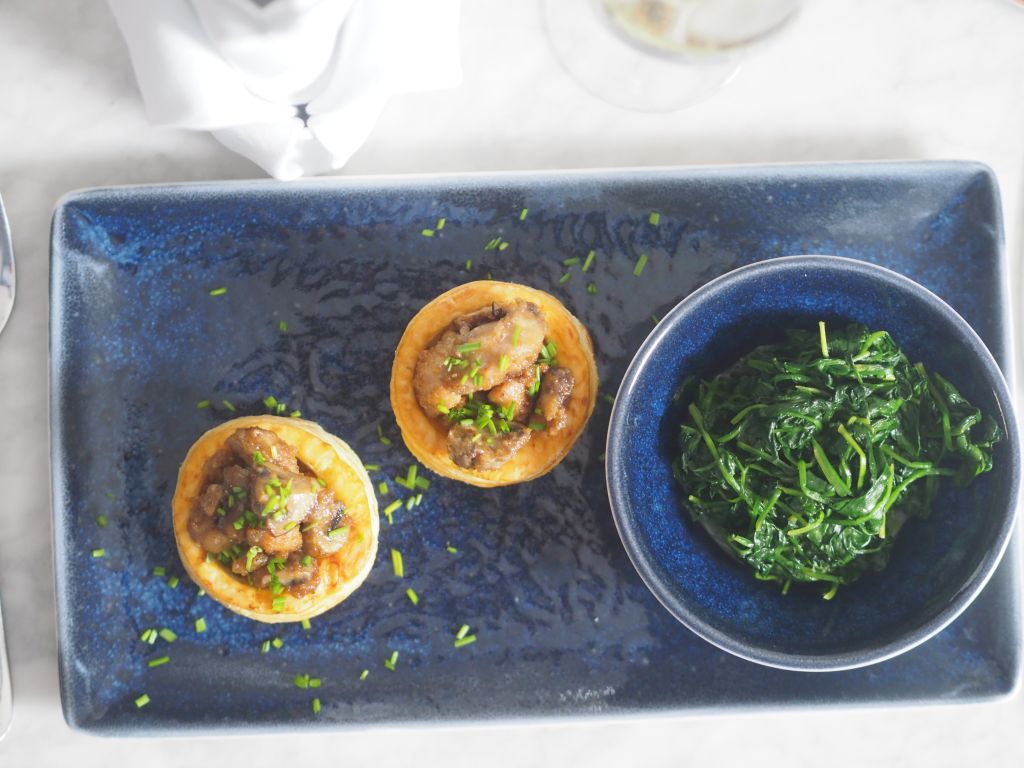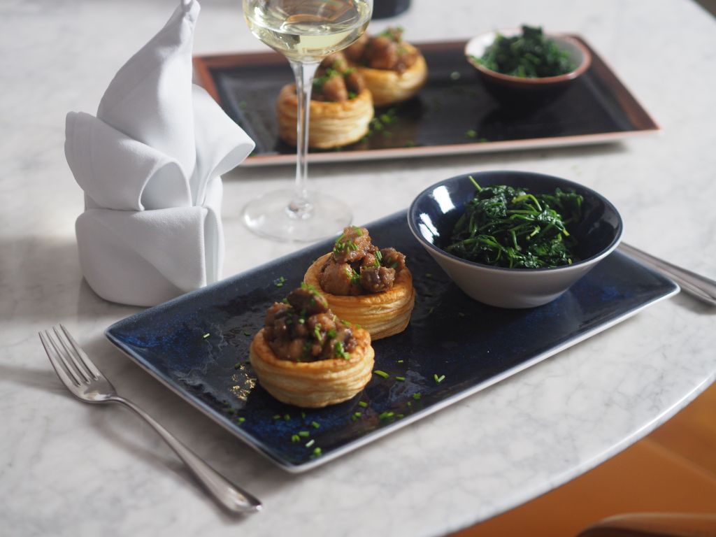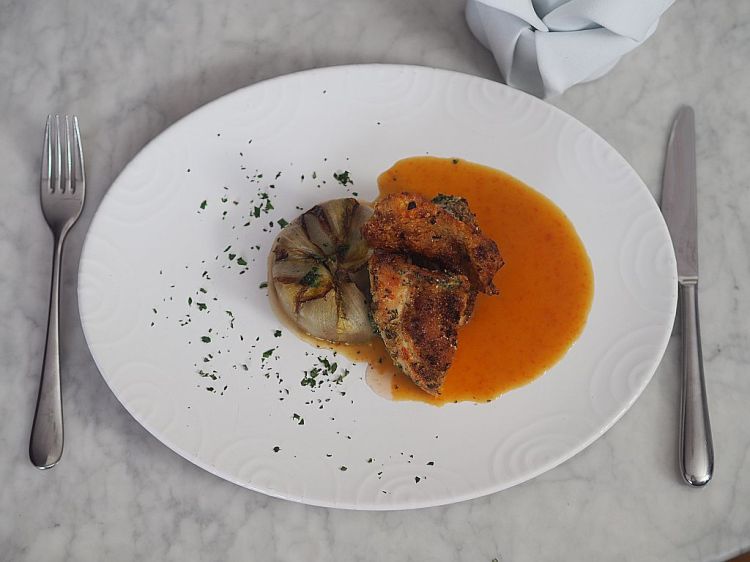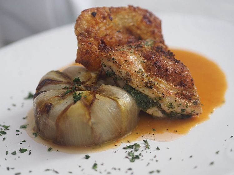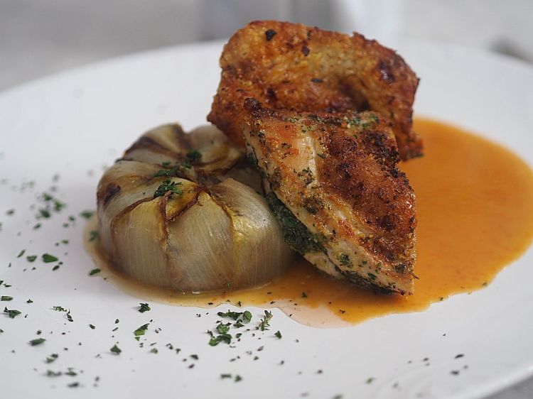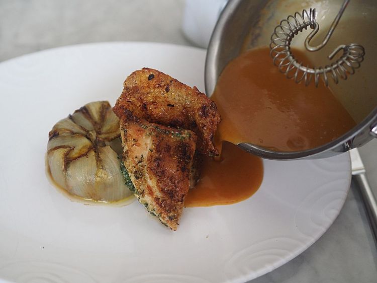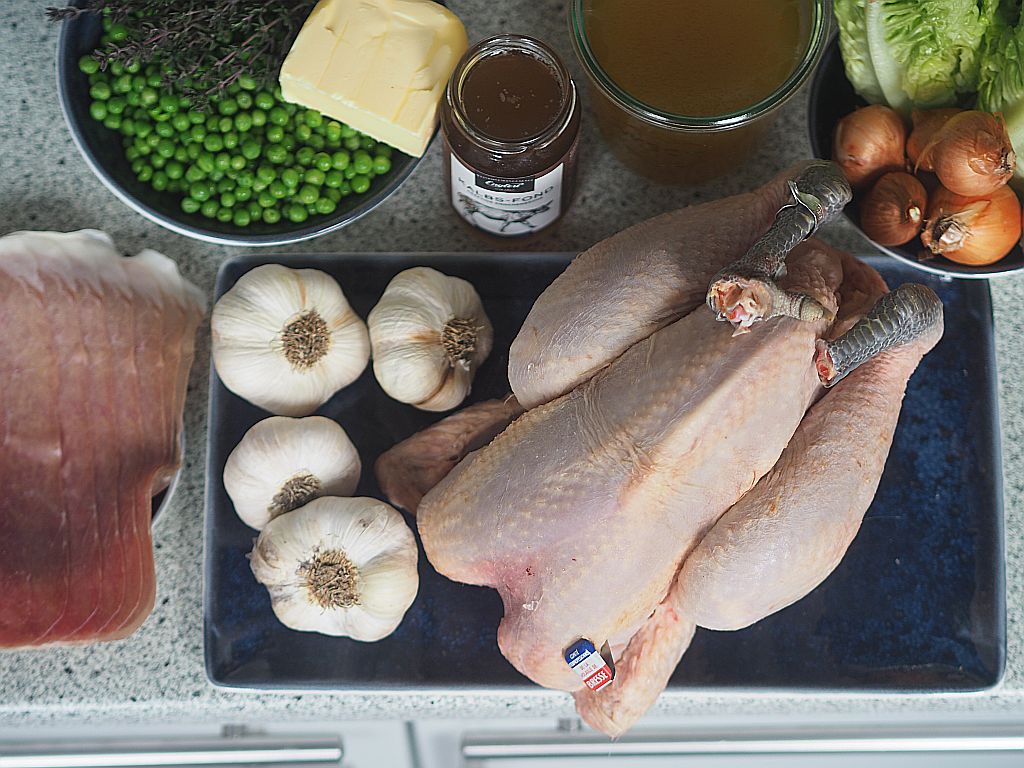Gebratenes Bressehuhn mit Erbsen „à la française“ und Bratenjus