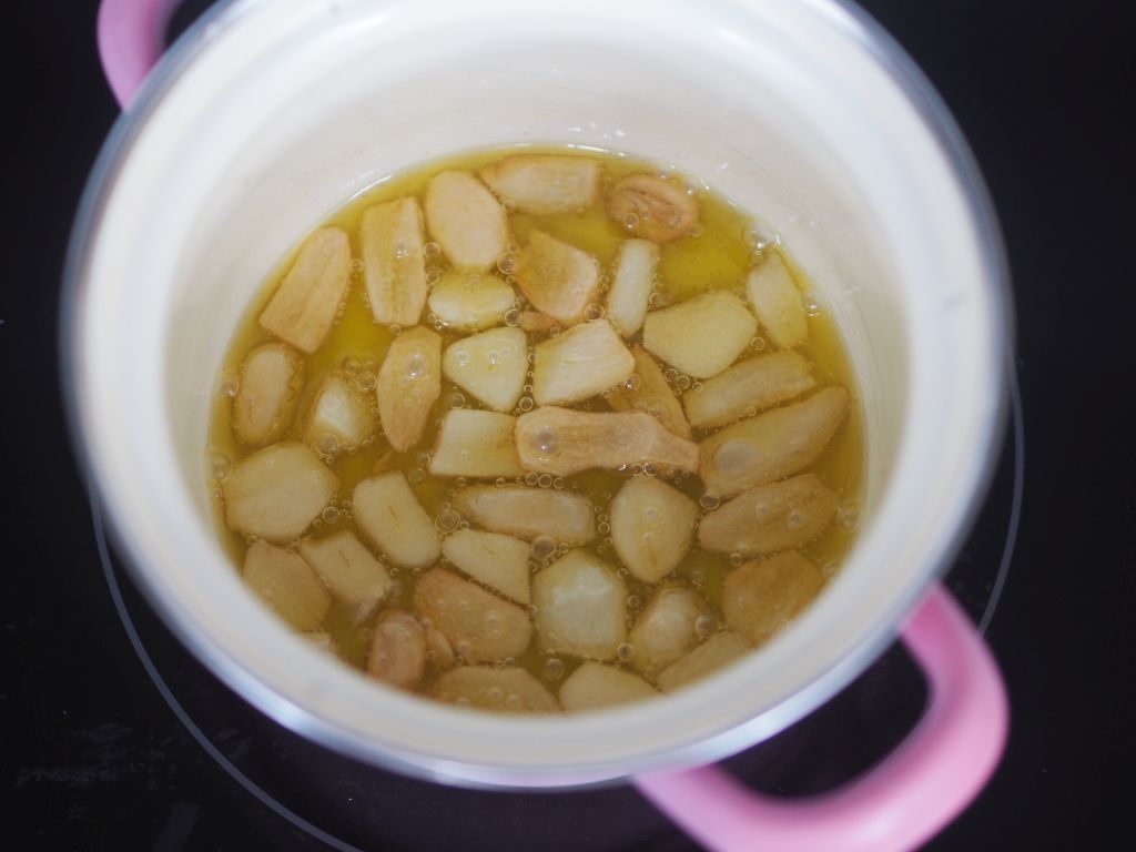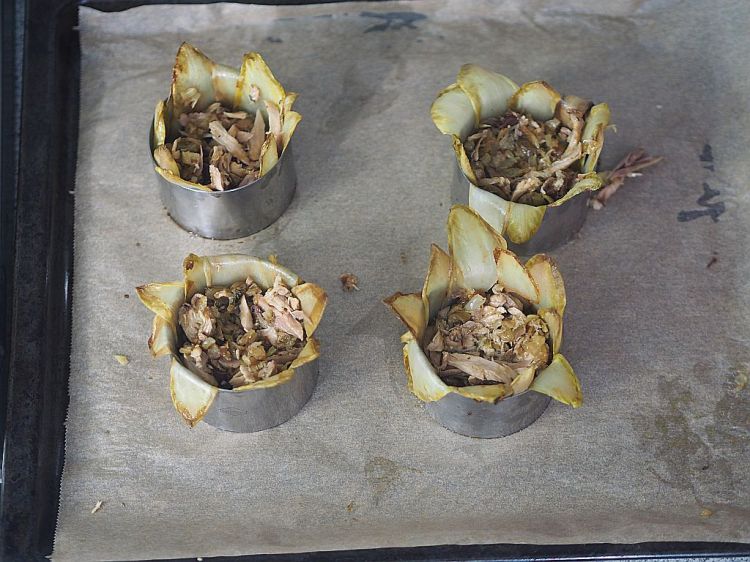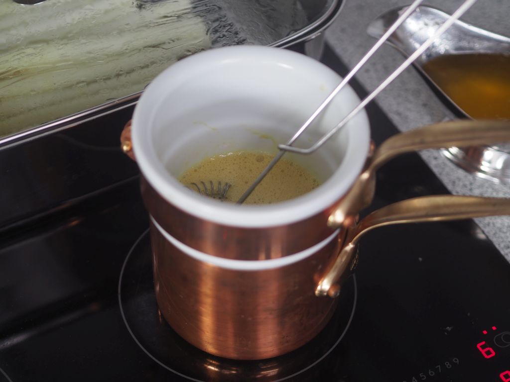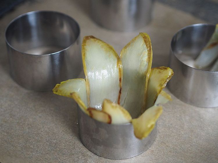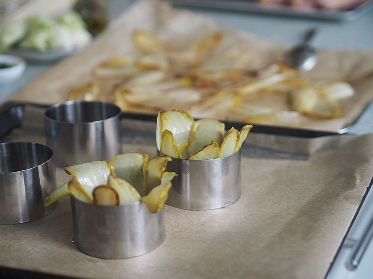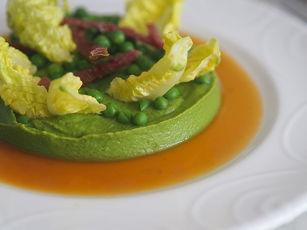 G e f l ü g e l j u s Am nächsten Tag zerkleinerte Geflügelkarkassen in Olivenöl anbräunen, Schalotten anschwitzen, mit der Hühnerbrühe ablöschen. Reduzieren. Wiederholen. Restlichen Hühnerfond und Kalbsjus dazugießen. 1 Stunde köcheln lassen. Angedrückte Knoblauchzehen dazugeben, simmern und abseihen. Abschmecken. Auskühlen lassen. K n u s p r i g e n S c h i n k e n Vulcano-Schinken in 3 mm dicke Schneiben schneiden und auf einem Backblech bei 85°C Umluft im Backrohr ausbacken. Halbierte Knoblauchknollen daneben legen. B r e s s e h u h n mit Butter einreiben und im Backrohr braten, regelmäßig begießen. E r b s e n und feingehackte Zwiebeln in etwas Olivenöl 2 Min. braten. Mit etwas Hühnerfond aufgießen, weitergaren. Ein paar Erbsen auf die Seite legen und die Erbsen mit dem Garsud pürieren, abseihen, abschmecken. Beiseitestellen.