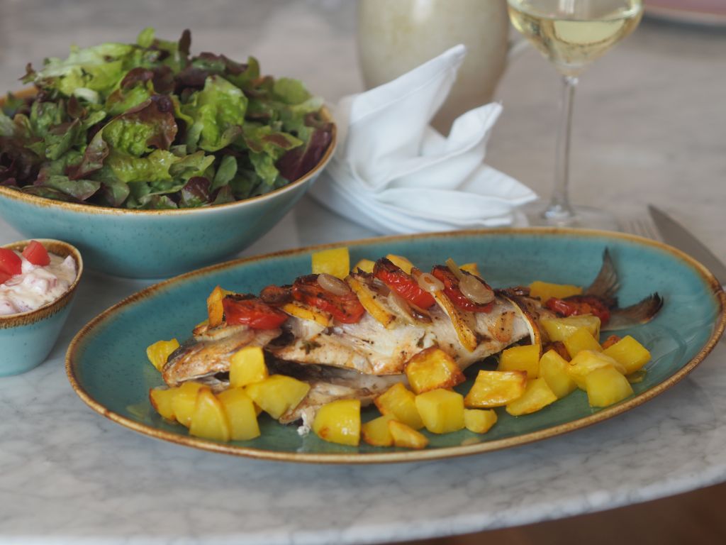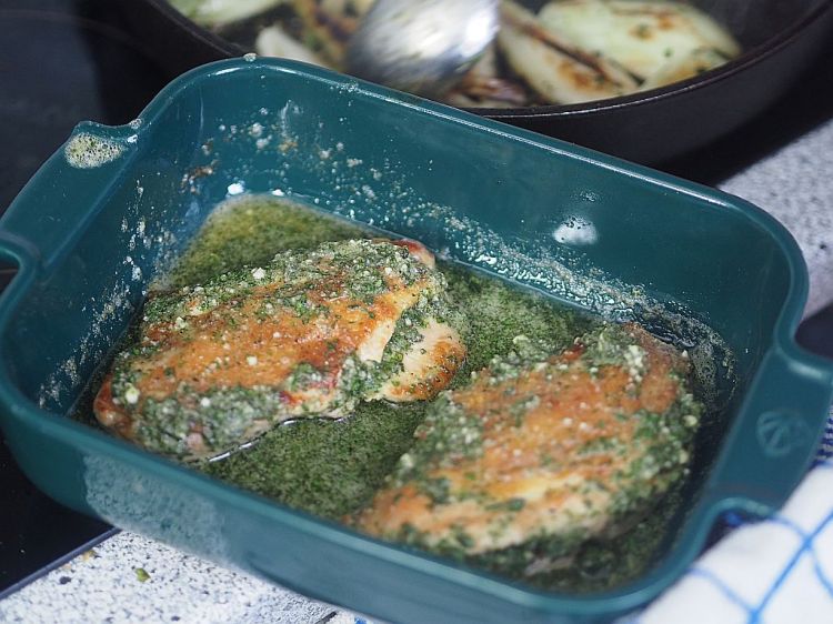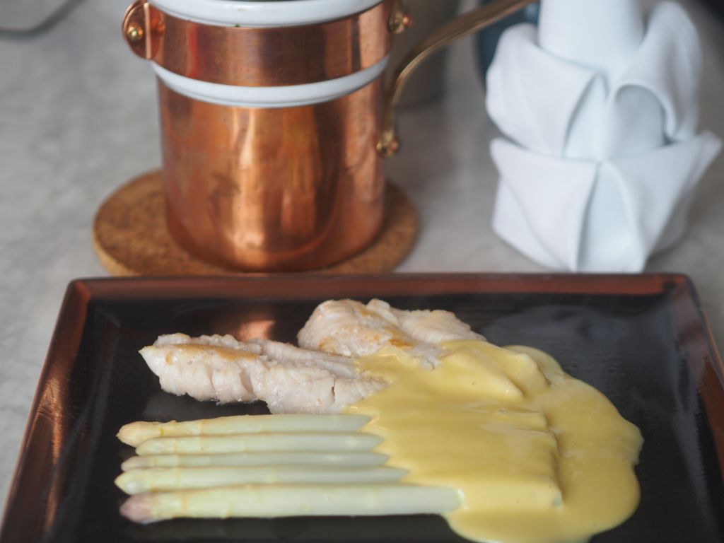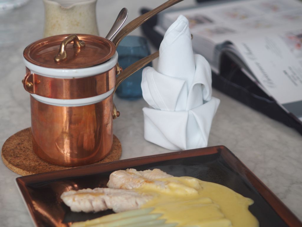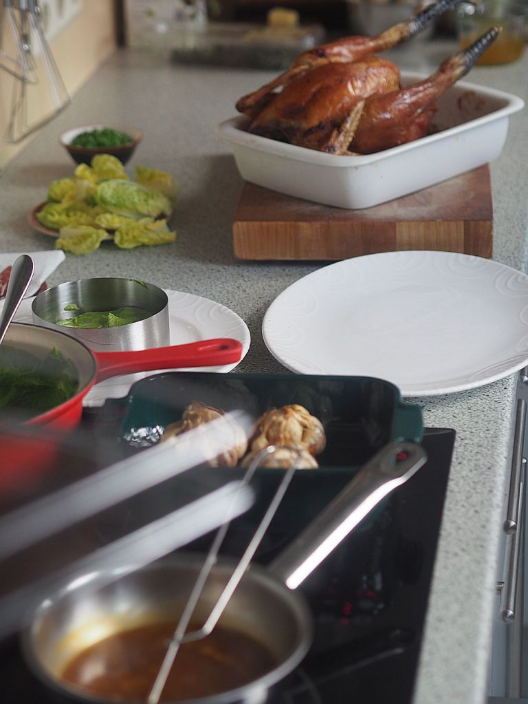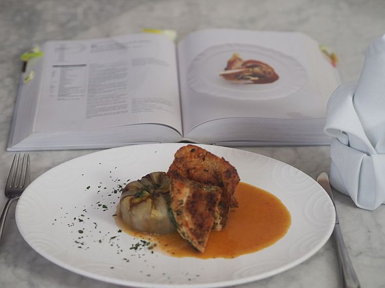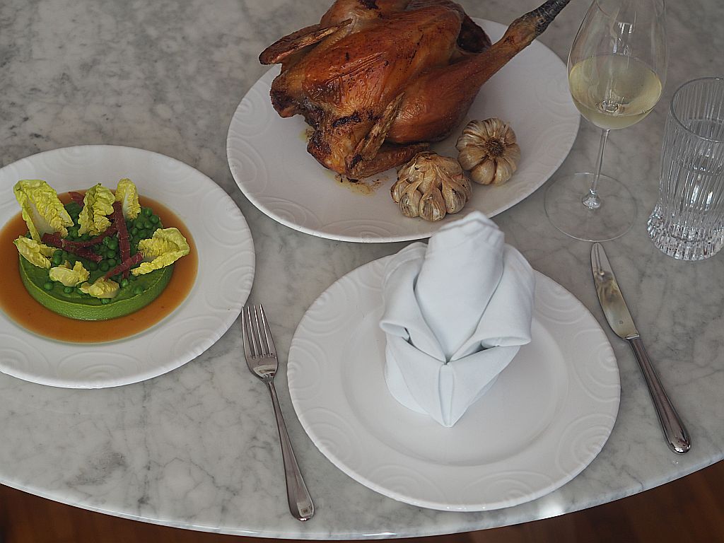 Die Hofköchin stellt vor: aus dem Buch „weltweit genießen“, einem „Grand Livre de Cuisine“ von Alain Ducasse: nach einem Rezept aus dem „Le Relais Plaza“, einem Restaurant in der Pariser Avenue Montaigne: Gebratenes Bressehuhn mit Erbsen „à la française“ und Bratenjus.
