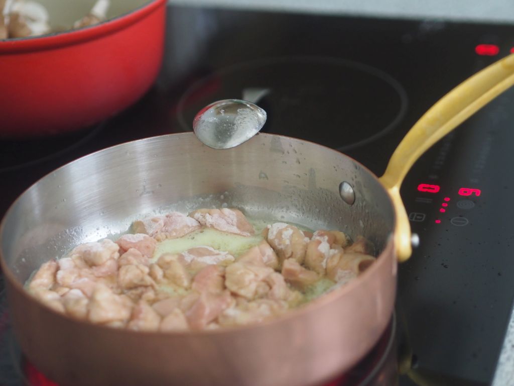 Bresse ist ein Gebiet nördlich von Lyon. Aus Lyon stammt Paul Bocuse, wie auch Alain Chapel, ein großer Verehrer des Bressehuhns. Von ihm gibt es ein Kochbuch mit seinen 10 besten Rezepten. Auf dem Titel des Buches ist Paul Bocuse abgebildet, in Kochmontur, ein Bressehuhn in der Hand. Eines der Rezepte ist für ein Frikassee vom Bressehuhn. Un grand classique de la région Rhônes-Alpes, la chair de la volaille de Bresse étant particulièrement savoureuse. Das macht neugierig! Es ist mit einer Schritt-für-Schritt-Foto-Anleitung. Von Christophe Muller! Doch leider. Wir können das nicht machen, wir haben die passenden Pilze nicht dazu: Morcheln werden verlangt.
