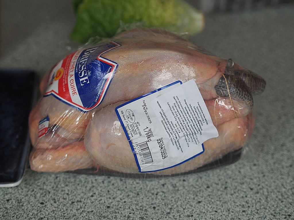 Kann man eigentlich Bressehühner außerhalb Frankreichs züchten? Theoretisch ja, praktisch nein, denn auch wenn man diese Geflügelart andernorts züchten würde, genauso wie in der Bresse, wären es keine Bressehühner mehr. Mit dem Ruhm kam auch der Betrug, wogegen man sich durch Kennzeichnung zu schützen suchte, mit blau-weiß-rotem Gütesiegel (Aluminiumklip), Fußring und geschützter Ursprungsbezeichnung AOP (Appellation d’Origine Protégée). Das sind aber nur die äußeren Kennzeichen, genaue Bestimmungen bei der Aufzucht wie Freiland, Platzbedarf und Futter gehören genauso dazu. Bei unserem Bressehuhn steht auf dem blau-weiß-roten Gütesiegel „Comité Interprofessionnel de la Volaille de Bresse“, für den über die Aufzuchtregeln wachenden Züchterverband CIVB, auf der Rückseite Mairet Simard, dem Namen und Ort des Schlachthofes. Auf dem Fußring des Züchters steht „Earl Laripe des chazeaux“, darunter „eleveur“, und darunter „71470 Menetreuil“ und rechts „Bresse“.