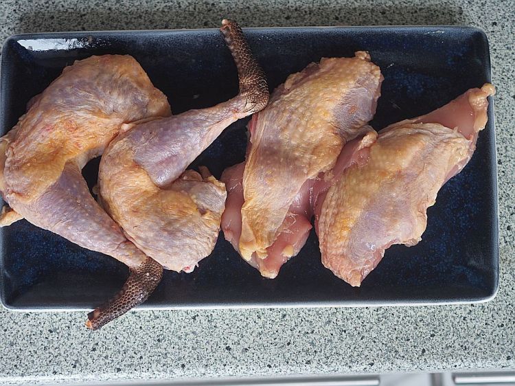 An Kopf und Hals verbleiben die Federn, damit man sich selbst von der Echtheit des Bressehuhns überzeugen kann. Allerdings bei unserem nicht, wir hatten ein Küchenfertiges ohne Kopf. Den charakteristischen Schnitt der Füße, bei dem nur die Mittelzehe stehen bleibt, sieht man aber auch bei unserem.