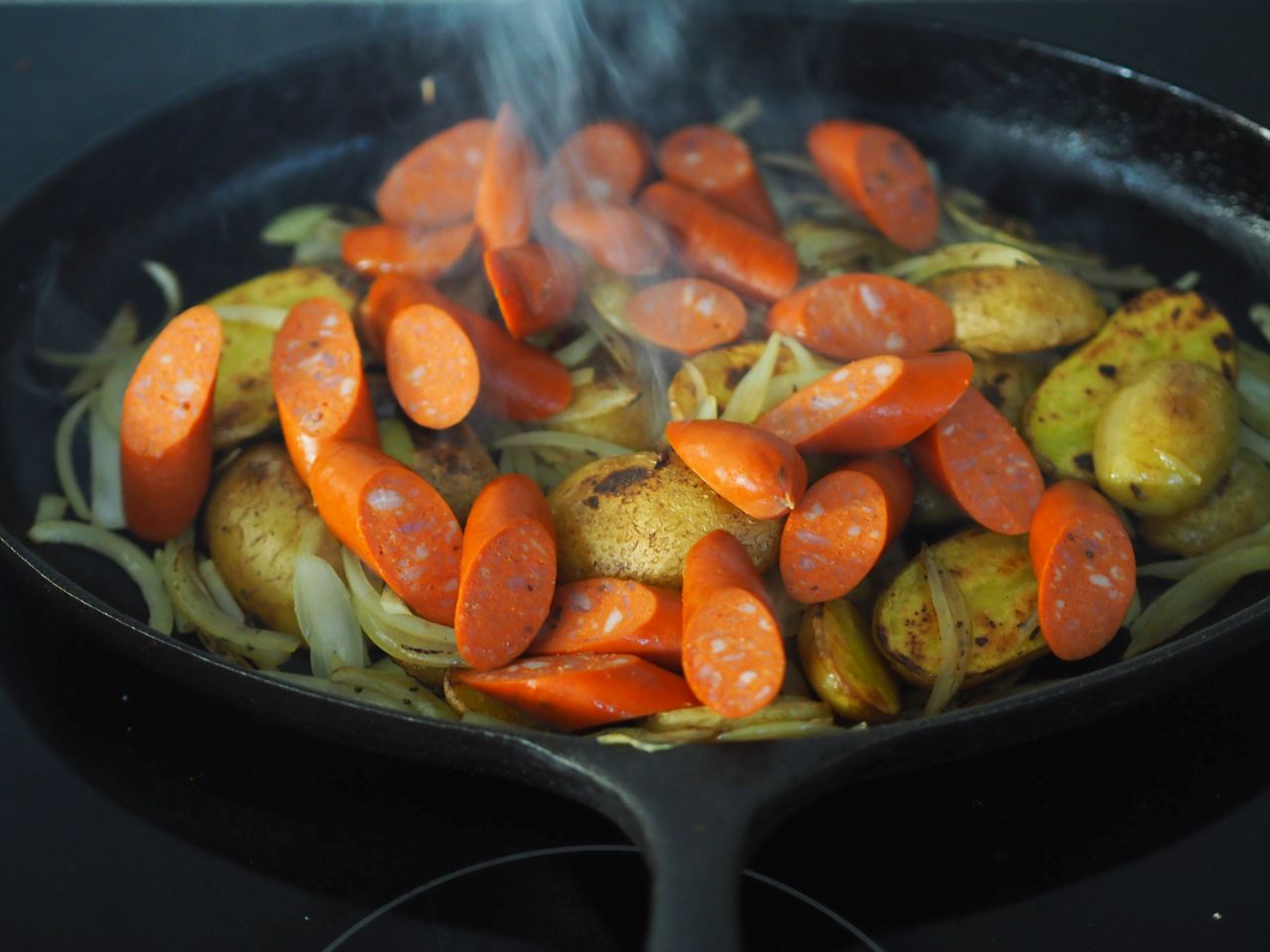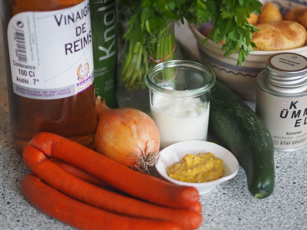 Aus einer Laune heraus haben wir Debreziner Würstel gekauft und wie es der Zufall so will, tags darauf ein Rezept dazu gefunden, beim Durchblättern von Alexander Herrmanns Kochbuch „Schnell mal was Gutes“. Dieses Kochbuch wird mir immer sympathischer. Lange Zeit haben wir es liegen gelassen und nun erst für uns entdeckt. Hier drin ist einfache Hausmannskost beschrieben mit ein paar nützlichen Tipps und Tricks, die es dann doch besonders machen. Zum Beispiel schreibt Alexander Herrmann, dass man in das Salzwasser für die Kartoffeln reichlichst Kümmel hineingeben soll, der Kümmel beim Herausheben ruhig darauf kleben bleiben darf, damit der Geschmack auch etwas eindringen kann, innen kann man ja nicht würzen.