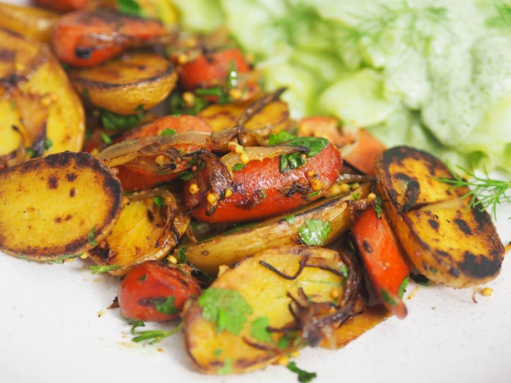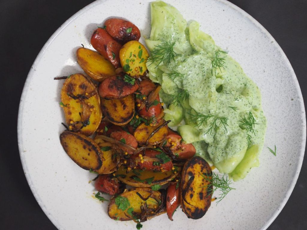 Erdäpfelgröstl mit Debreziner und Gurkensalat