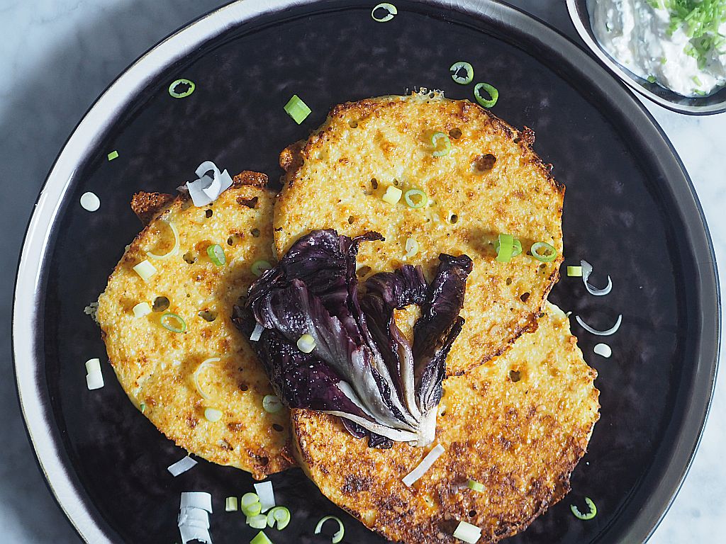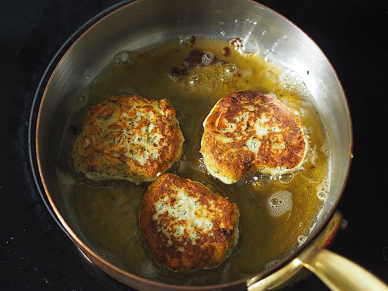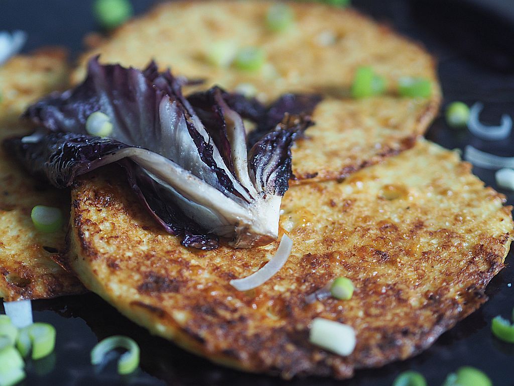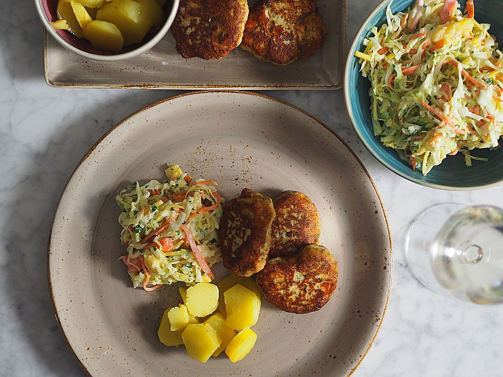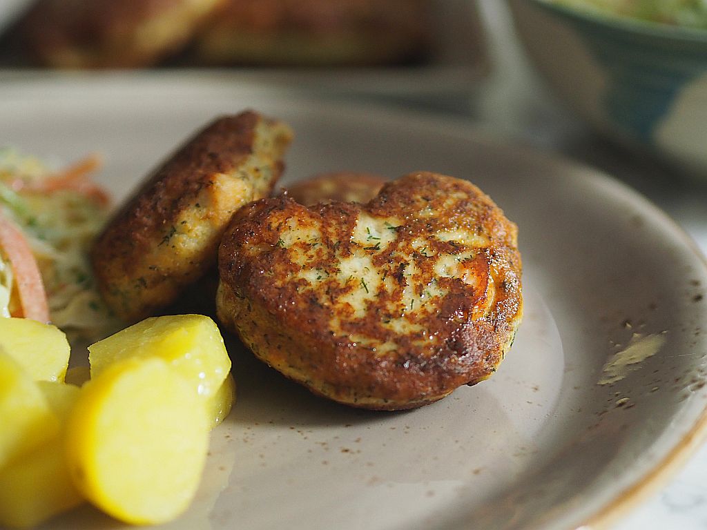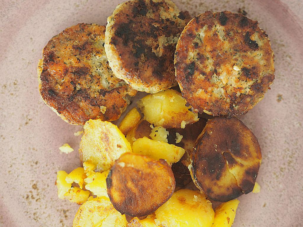 Rezept Faschierte Lachs-Kabeljaulaberln mit Bratkartoffeln und Chicorée-Radicchio-Salat