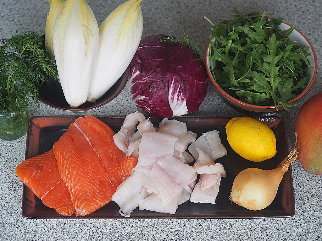 Die Hälfte der vom letzten Mal übrig gebliebenen Abschnitte vom Kabeljau sowie 300 g Lachsschwänze o.H. faschieren, die andere Hälfte in kleine Würfel schneiden. Ein Ei, einen Bund gehackte Dille, eine gehackte und in Olivenöl angeschwitzte Zwiebel, Abrieb einer Zitronenschale dazu geben. Verrühren und mit den Händen Laberln formen. In der Pfanne mit Olivenöl braten, ein paar Minuten nur, daß es gerade durch ist und noch schön saftig! Dazu Braterdäpfeln und einen Salat machen: aus Chicorée, Radicchio, Rucola und Mango. Mit Sherry-Essig und Olivenöl marinieren.