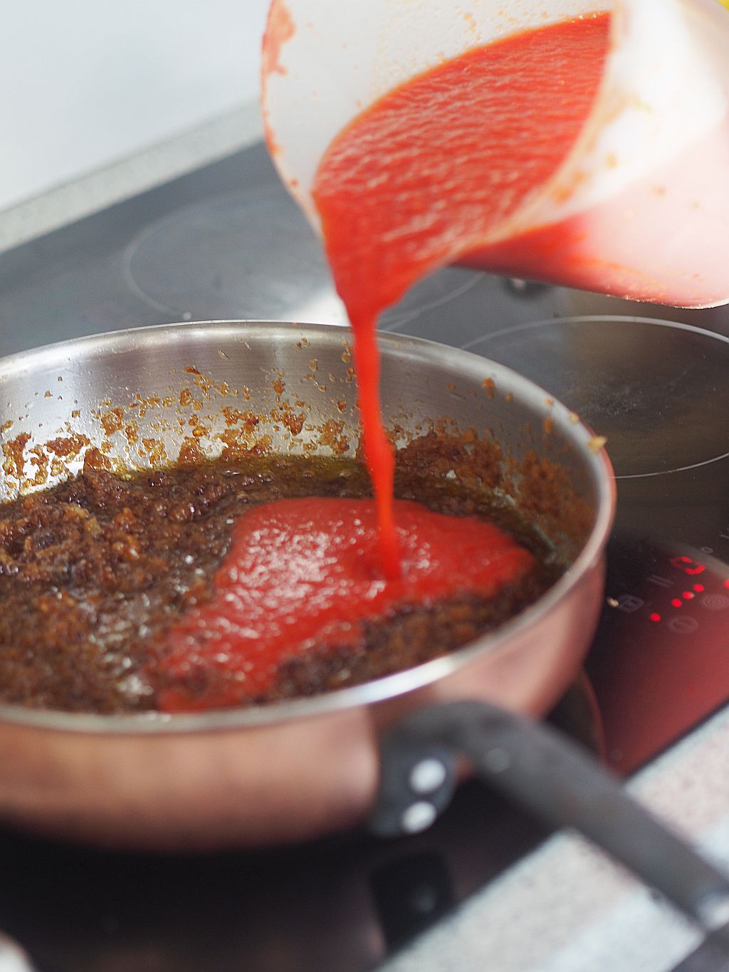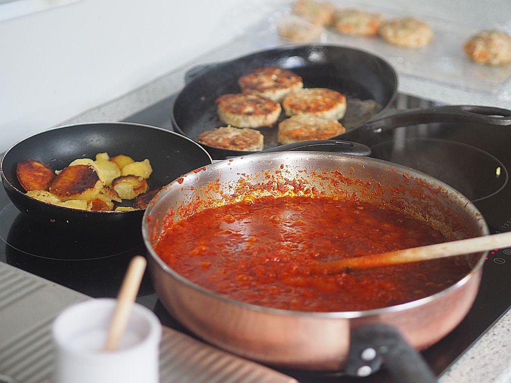 Anmerkung: Gleichzeitig wurde Sofrito gemacht für ein anderes Gericht, für Bohnengulasch. Das Sofrito ist auf dem dritten und vierten Bild zu sehen, es muß lang köcheln.