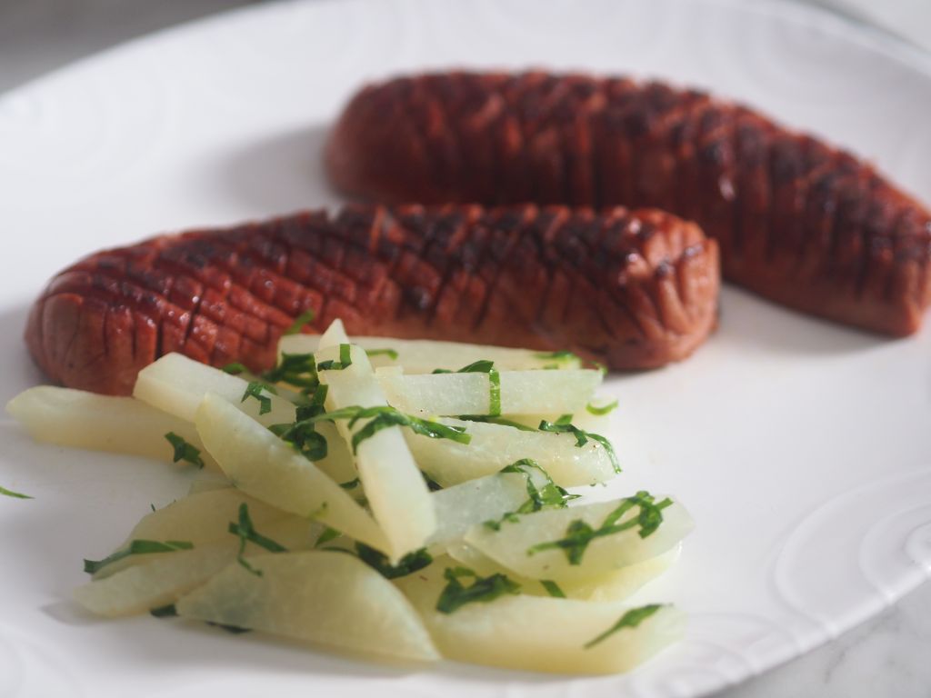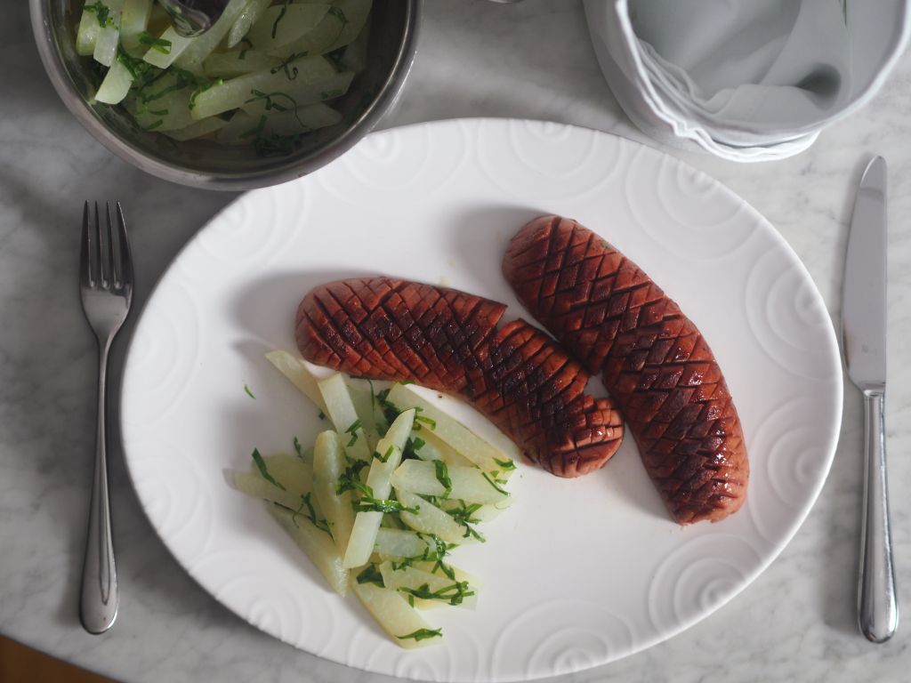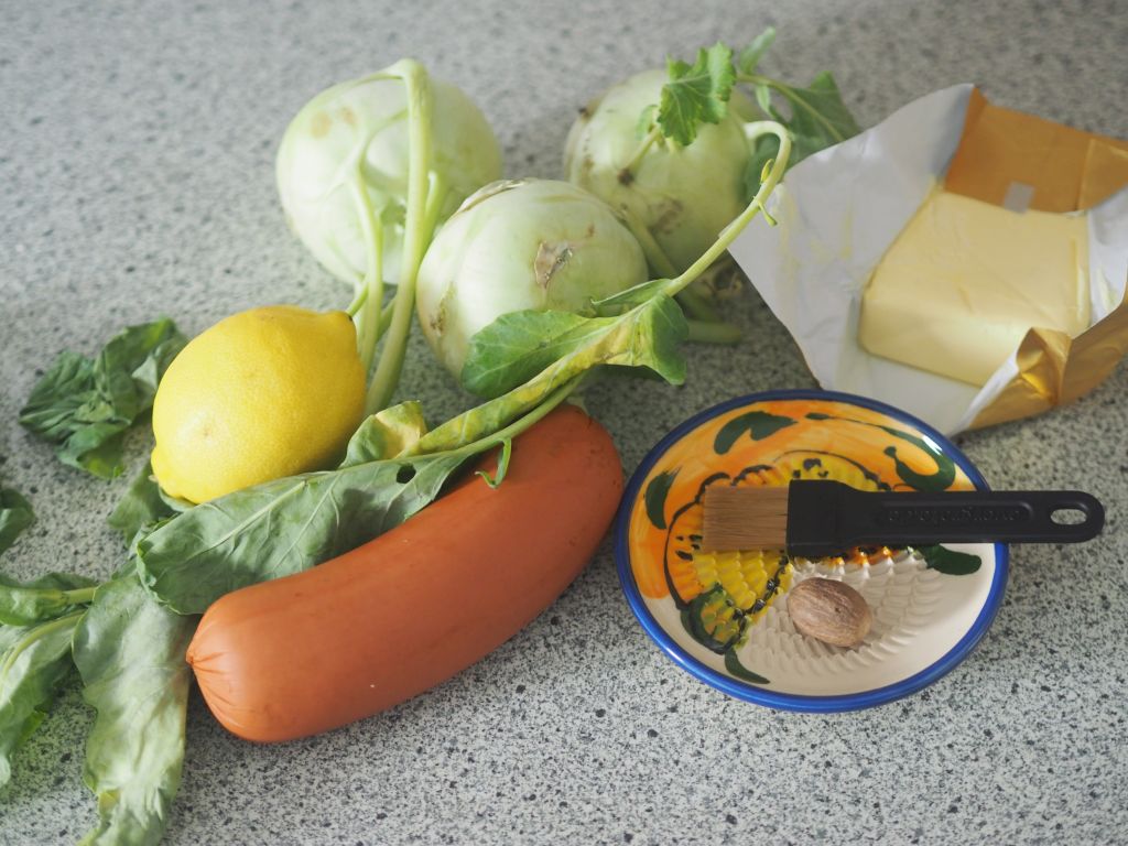 Augsburger mit Kohlrabi ist ein Klassiker, ein Arme-Leute-Essen könnte man heute sagen, früher aß das praktisch jeder.