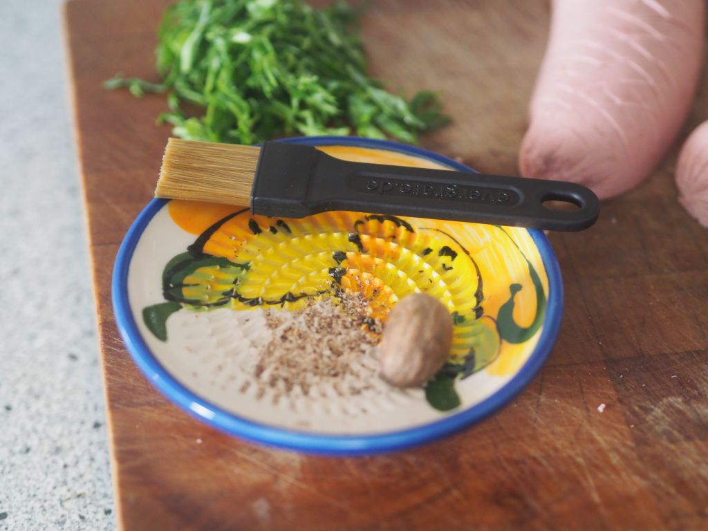 V o l – a u – v e n t s Auf leicht bemehlter Arbeitsfläche Blätterteig ausrollen und 40 Kreise mit 7 cm Durchmesser ausstechen. 30 Kreise mit einem 5 cm Ausstecher zu Ringen ausstechen. Die Ringe mit Dotter bepinseln. 10 vol-au-vents auf einem mit Backpapier ausgelegten Backblech aufbauen; Für 1 Vol-au-vent werden 3 Ringe auf einem Boden aufgetürmt. Eine Stunde im Kühlschrank ruhen lassen. I n d e r Z w i s c h e n z e i t Die ausgestochenen Mittelteile im Backrohr herausbacken. Mit Kümmel bestreuen. Ein Snack für den Koch. K a l b s b r i e s Das Kalbsbries säubern, 1 ½ Min. in kochendem Wasser blanchieren, abschrecken, enthäuten und in Stücke teilen. N a c h e i n e r S t u n d e die vol-au-vents aus dem Kühlschrank nehmen, die Türme oben mit Dotter bestreichen. Ein Blatt Backpapier mit Olivenöl bestreichen und mit der Olivenölseite nach unten auf die vol-au-vents legen. Im Backrohr bei 200° C 30 Min. backen, nach 20 Min. das Backblech herausnehmen, Ungleichheiten in der Höhe der vol-au-vents mit einem flachen Schneidbrett ausgleichen, falls notwendig. Und um 180° verdrehen; eventuelle Ungleichheiten der Hitzeentwicklung im Backrohr werden so umgangen. I n d e r Z w i s c h e n z e i t Das Kalbsbries in Mehl wenden. In einer Pfanne Butter und Olivenöl bei mittlerer Hitze erwärmen bis die Butter schäumt. Das Kalbsbries darin 5 Min. brutzeln lassen, bis es goldbraun ist. Mit Semmelbröseln bestreuen und eine weitere Minute. Beiseite stellen und auf Küchenkrepp abtropfen lassen. S p i n a t Blattspinat in einem Topf mit Butter erwärmen, Spinatblätter hineingeben, mit der Knoblauchgabel solange verrühren, bis die Blätter zusammengefallen sind. P i l z e Champignons vierteln oder halbieren. Olivenöl und Butter in einer Pfanne erwärmen. Die Pilze darin 3 bis 4 Min. anbraten. 100 ml Sahne dazugießen, salzen, einköcheln. Na c h 3 0 M i n u t e n die Wölbung in den herausgebackenen vol-au-vents mit einem Messer herausschaben. Weitere 10 Min. ins Backrohr schieben. I n d e r Z w i s c h e n z e i t das Kalbsbries zu den Pilzen geben. N a c h 1 0 M i n u t e n die vol-au-vents herausnehmen. A n r i c h t e n vol-au-vents mit der Kalbsbries-Pilz -Mischung befüllen. Spinat daneben legen. Mit Schnittlauch bestreuen.