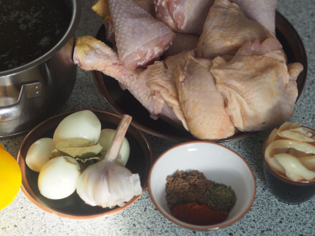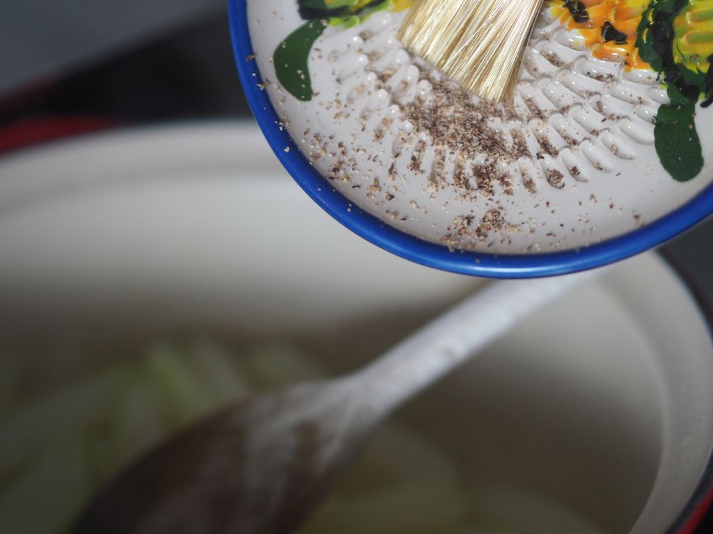 2 feingehackte längliche Schalotten in 80 g Butter anlaufen lassen, 40 g Mehl dazu geben, einige Zeit köcheln lassen und verrühren, etwa 15 Min. bis der Mehlgeschmack weg ist. Mit etwa ½ L Rindsuppe aufgießen. Aufgeschnittene 200 g Shiitake-Pilze dazugeben, mit Salz abschmecken.