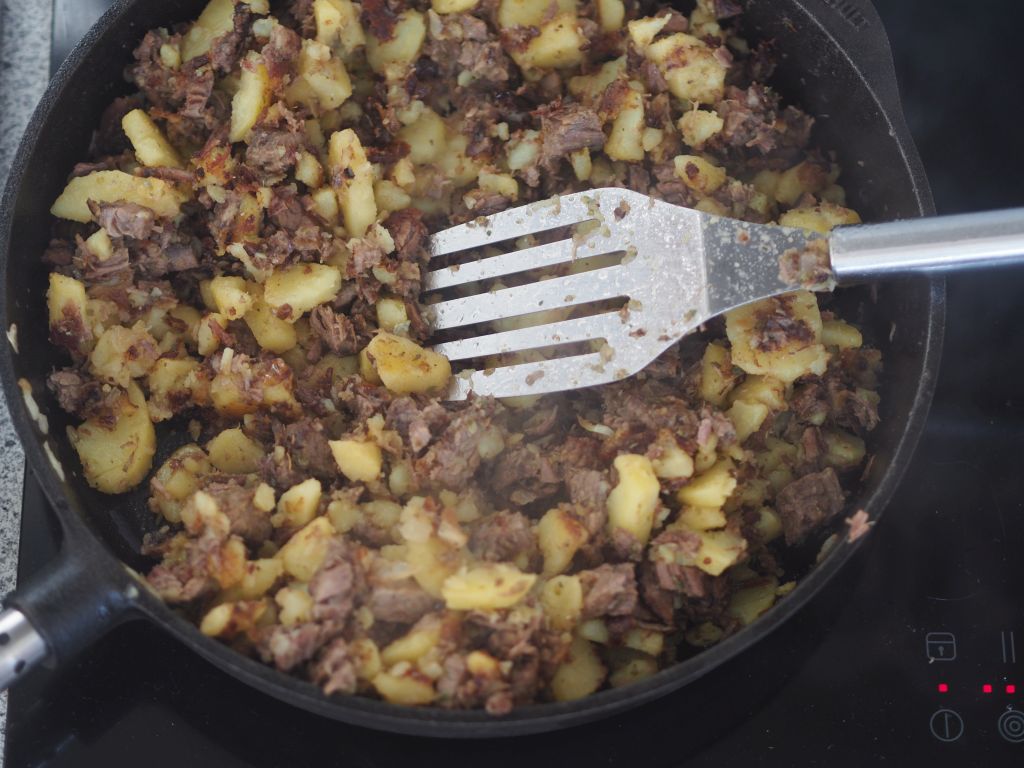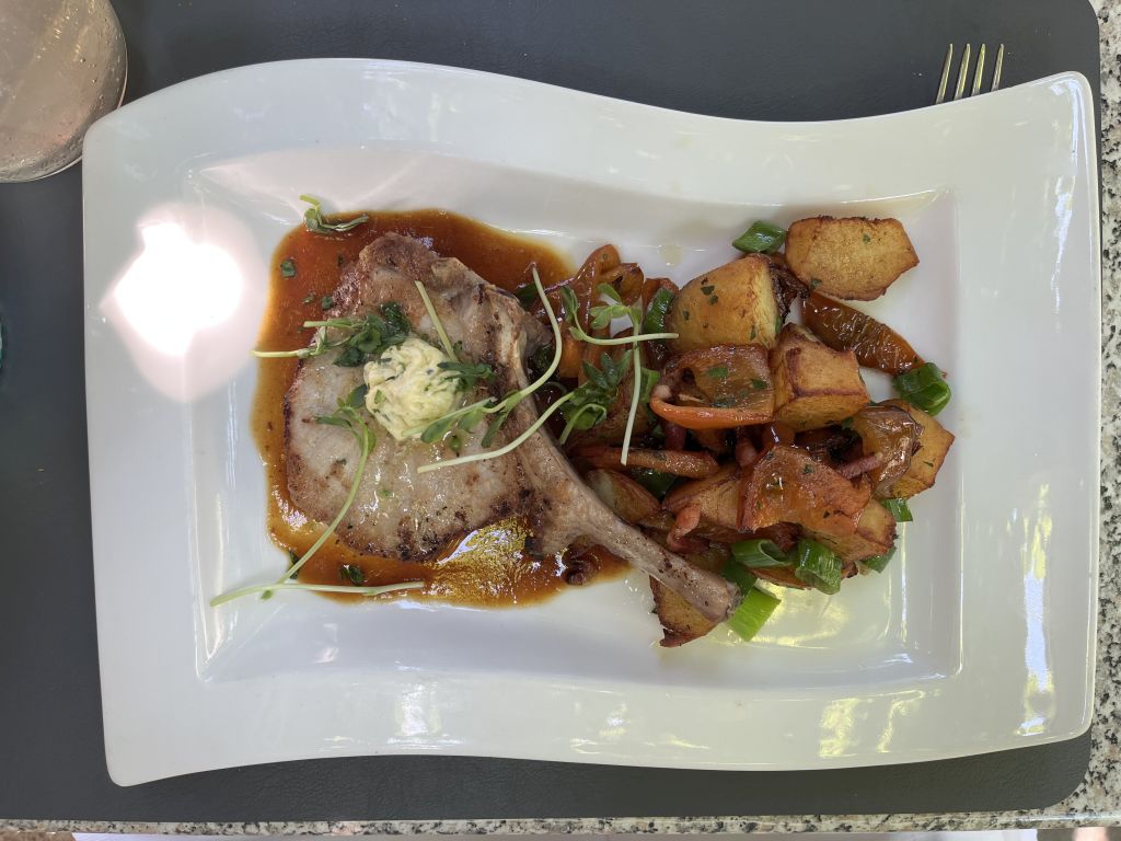 Gebratene Mangalitza-Schweinskrone mit Erdäpfelgröstl. Die Kartoffeln waren selber geschnitten! Dazu Laguiole-Besteck, wie bei einem Steak in Frankreich!