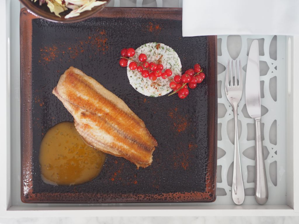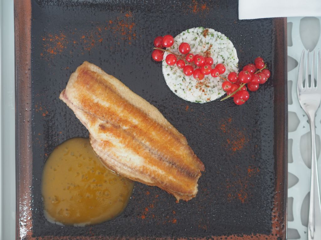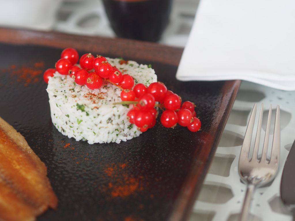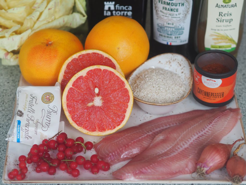 Fein gehackte Schalotten in Butter hell anschwitzen. Und anschließend mit Noilly Prat ablöschen. Einköcheln lassen und den frisch gepreßten Grapefruit-Saft, das Fruchtfleisch abseihen, dazugeben und auf weniger als die Hälfte einköcheln. In der Zwischenzeit den Reis aufsetzen, bzw. das Dressing für den Salat vorbereiten: Erdbeeressig von Stekovics, Mandelmus, Dijonsenf, Ahornsirup, Salz, geriebene Schale einer Limette und den Saft sowie Grapefruit-Saft vermischen. Zum Schluß frisch gehackte Petersilie und Thymian einrühren. Radiccho Castelfranco und gesprenkelten Radicchio in mundgerechte Stücke schneiden und in ein Gefäß geben. Dazwischen immer wieder den köchelnden Grapefruit-Saft umrühren. Wenn der schon fast fertig ist, das Welsfilet auf beiden Seiten in Kokosöl braten. Wenn der Reis dann fertig ist, frisch gehackte Petersilie und Thymian einrühren und zum Schluß in die Grapefruit-Soße mit etwas Butter und Reissirup einrühren, mit Maisstärke binden. A n r i c h t e n Fisch und Reis auf den Teller legen und mit Ribisel garnieren. Etwas Soße dazu und den Salat mit der Marinade beträufeln.