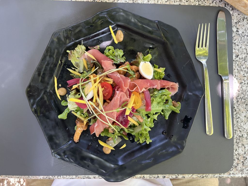 Eierschwammerl-Salat mit Prosciutto und Wachtelei. Der Salat knackfrisch. Hier kommt nichts vom Metro.