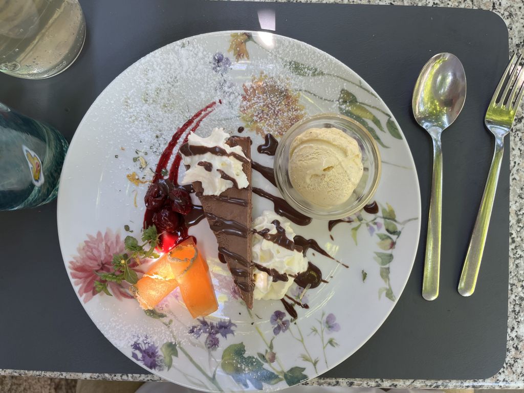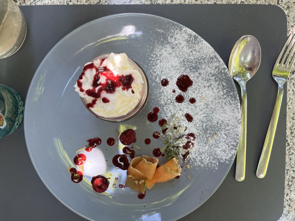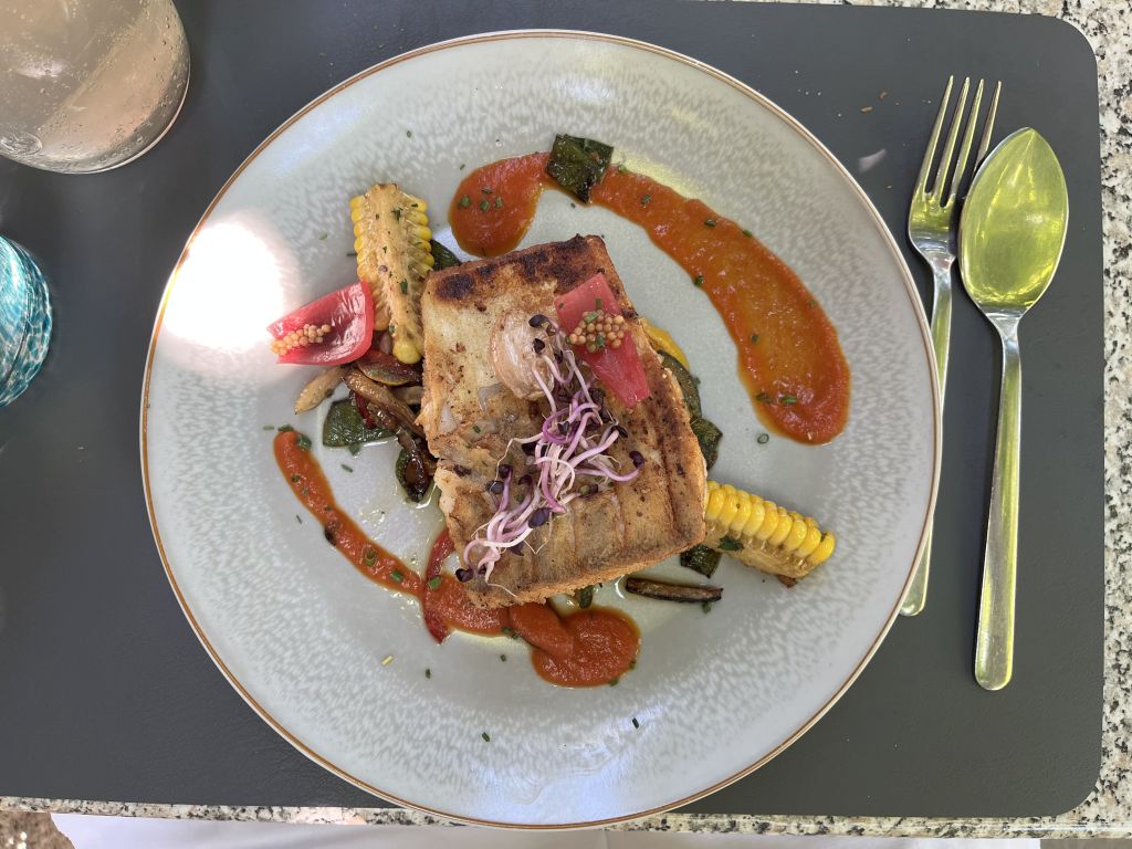 Gebratenes Zanderfilet mit Grillgemüse. Der Mais ist in Rippchen geschnitten, das war ein bißchen kompliziert zu essen, aber es hat sich gelohnt. Als Getränke gab es Alkoholfreies, Zitrone-Melisse gespritzt und Wiesensalbei gespritzt.