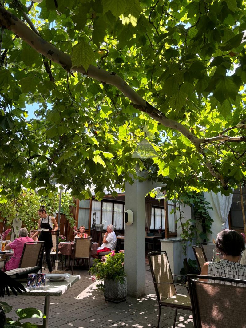 Im schattigen Gastgarten vom Presshaus in Illmitz ließ es sich bei der Affenhitze durchaus aushalten.