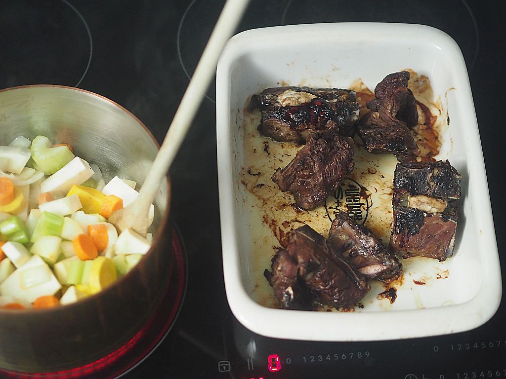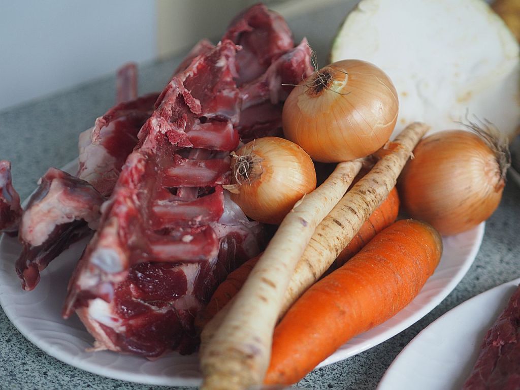Für die Soße: ½ kg TK-Wildknochen, 2 große Zwiebel, 2 Karotten, ¼ Knollensellerie, 2 Stangen vom Stangensellerie, 1 Petersilienwurzel, Butterschmalz, 3 EL Soffritto, 400 ml Portwein, Lorbeerblatt, Wacholderbeeren, Peerkörner, Thymianzweig und Rosmarinzweig.