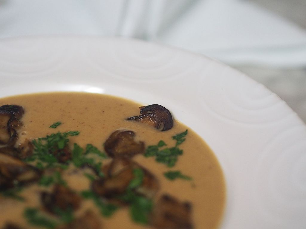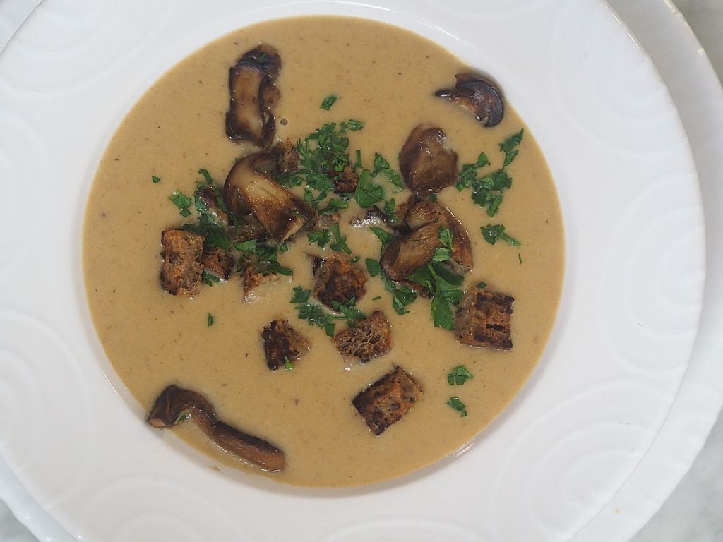 Die gehackte Zwiebel in Butterschmalz anschwitzen. die gewürfelten Erdäpfel hineingeben und mitschwitzen. Von den TK-Steinpilzen ein paar schöne Stücke auf die Seite stellen. Die restlichen Steinpilze zu den Kartoffeln geben und anbraten. Mit Gemüsebrühe aufgießen, bis es zugedeckt ist. Das Gemüse weichköcheln. Auskühlen lassen. Im Standmixer pürieren. Durch ein Sieb streichen. Das Schlagobers und wenn nötig, etwas Gemüsebrühe dazugeben. Mit Salz und Zitronensaft abschmecken. A n r i c h t e n Die auf die Seite gelegten Steinpilze in der Pfanne anbraten und in die Suppe geben. Roggenbrotwürfeln anbraten und in die Suppe geben. Mit Petersilie bestreuen.