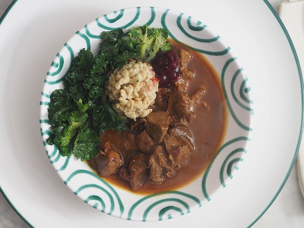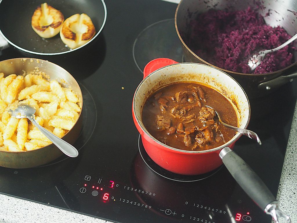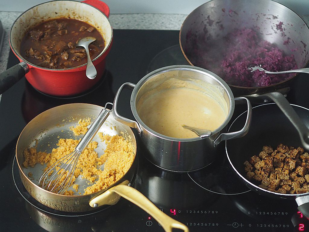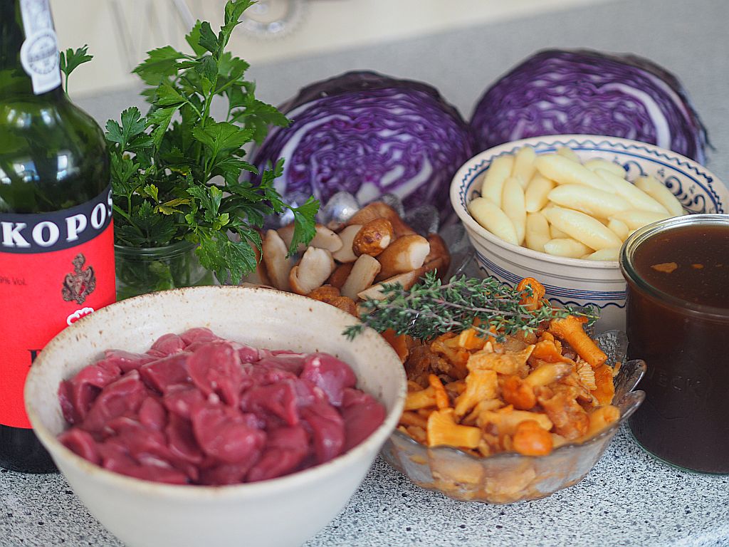 Für das Rehragout: 850 g Rehschulter, Butterschmalz, 1 EL Soffrito, Portwein, Salz, Lorbeerblatt, Wacholderbeeren, Thymian, Rosmarin, 350 g Eierschwammerl, Kartoffelschupfnudeln, Butterbrösel, ½ Rotkrauthappel, Salz, 10 Zwetschken, 1 rote Zwiebel, Gemüsebrühe, Rotweinessig