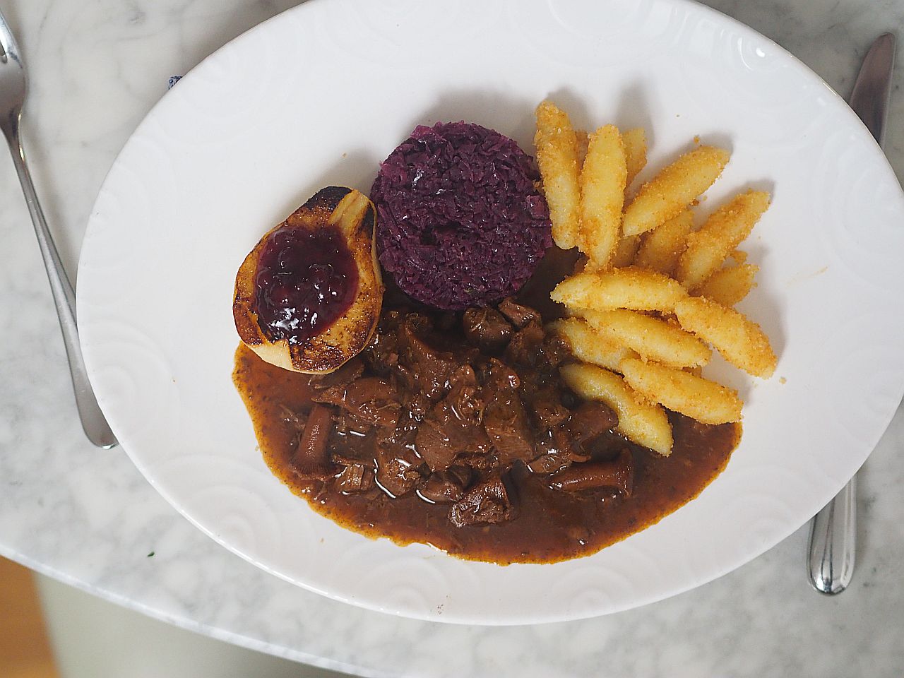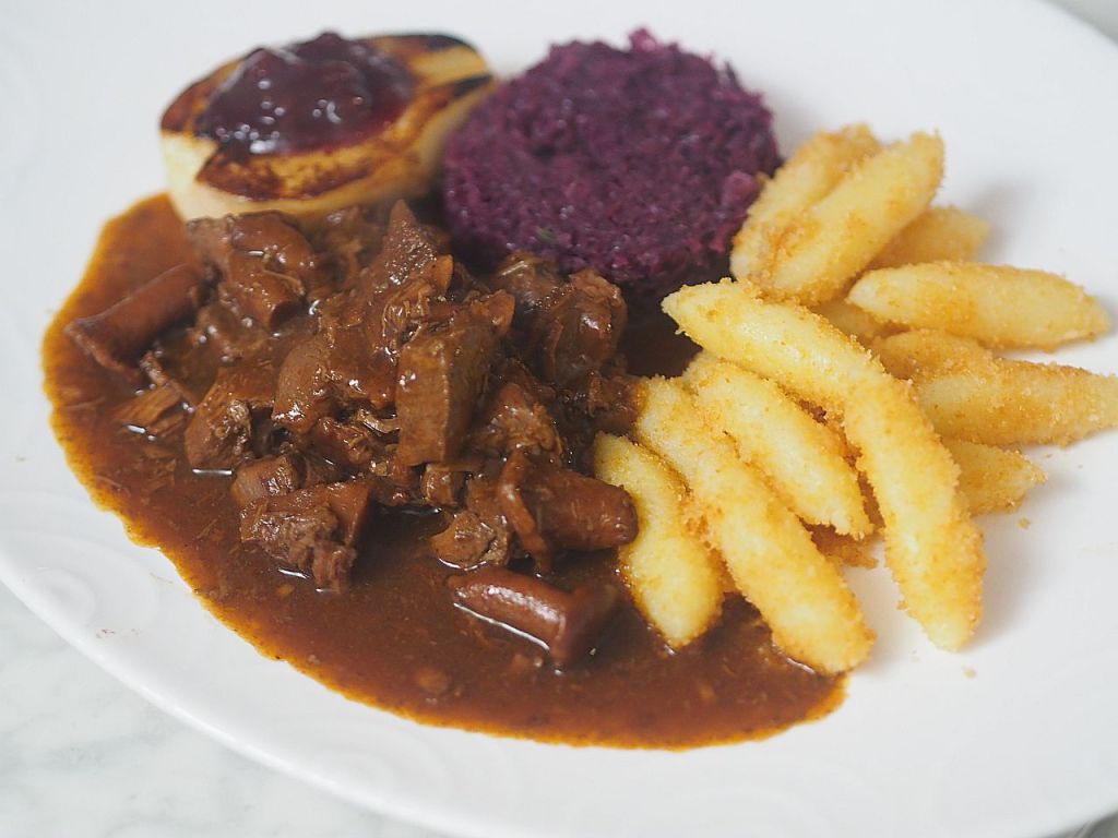 Rehragout mit Eierschwammerl Rotkraut und Schupfnudeln in Wildsoße