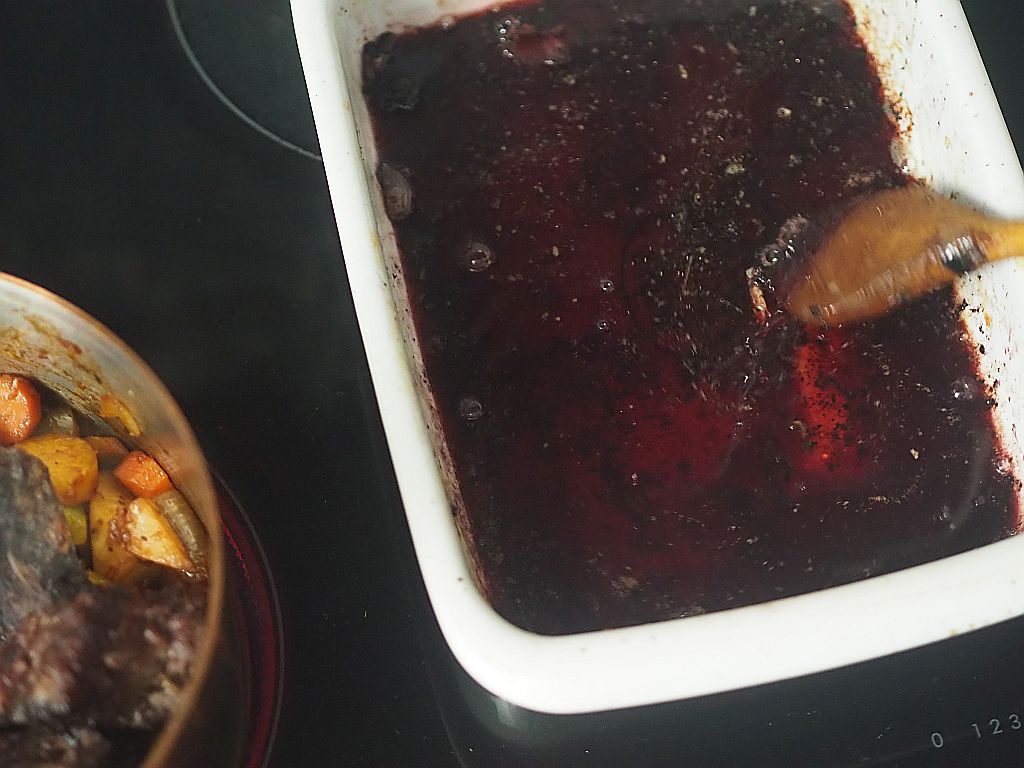 Am nächsten Tag die Rehschulter in der Pfanne in einem Teil des Butterschmalzs anbraten, Soffrito mitanbraten und mit einen großen Schluck Portwein ablöschen. Mit der Soße aufgießen. Salzen, einen Gewürzsack vorbereiten: in einen Teebeutel Lorbeerblatt, Wacholderbeeren, abgerebelter Thymian und Rosmarin geben und den Teebeutel hineinlegen. 2 Stunden leise köcheln lassen. In der Zwischenzeit 350 g Eierschwammerl in der Pfanne anbraten und in der letzten halben Stunde zum Rehragout geben. dazu Kartoffelschupfnudeln machen, mit Butterbrösel. Sowie Rotkraut hobeln, salzen und ziehen lassen. In der Zwischenzeit die Zwetschken durch die Saftpresse drücken, und eine eingehackte rote Zwiebel in Butterschmalz anschwitzen. Das Rotkraut ausdrücken. Zu den Zwiebeln geben, ein paar Minuten mitschwitzen. Den Zwetschkensaft dazugeben. Mit Gemüsebrühe aufgießen, bis es leicht abgedeckt ist. Eine Dreiviertelstunde köcheln lassen. Bis die Flüssigkeit weg ist. Mit Rotweinessig und Salz abschmecken.