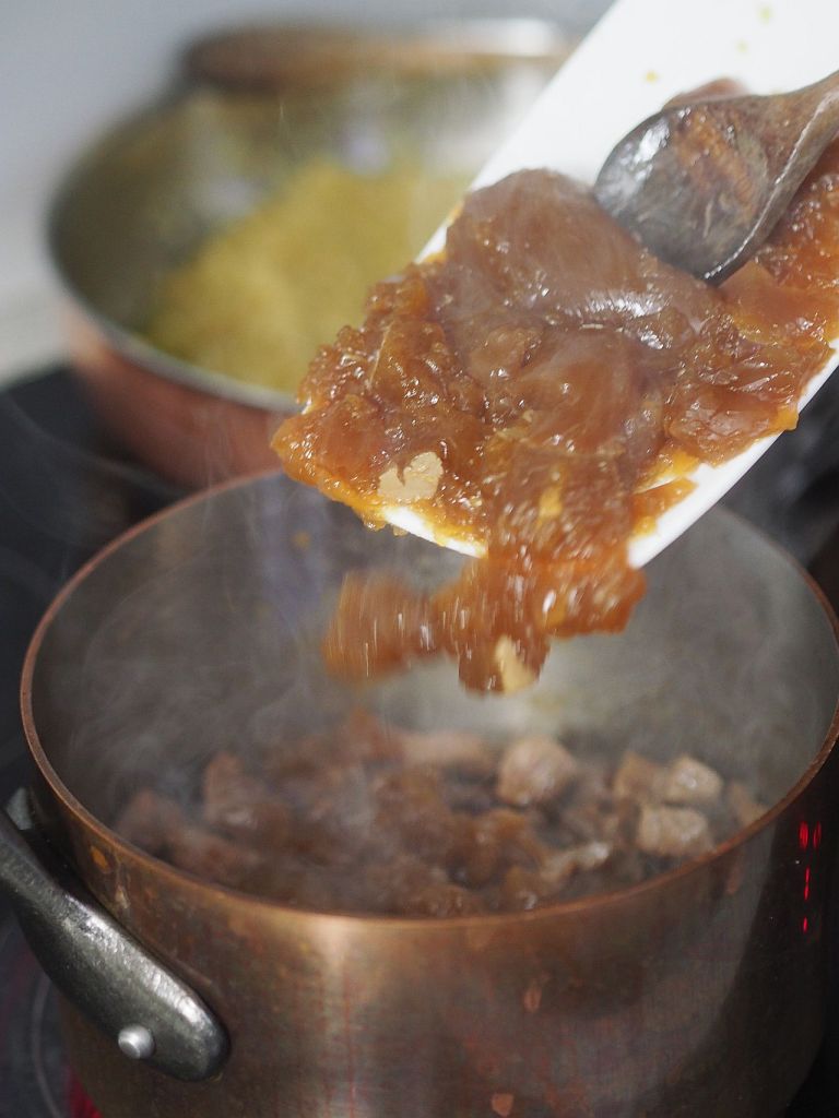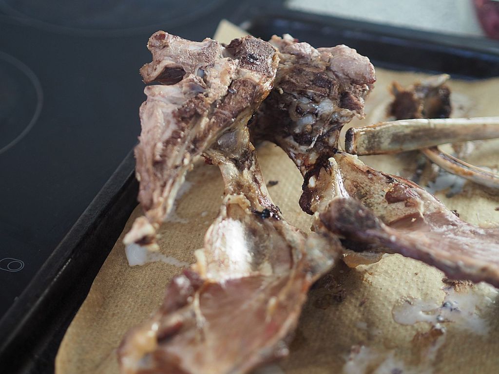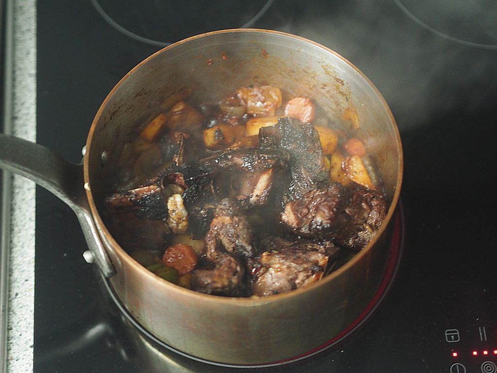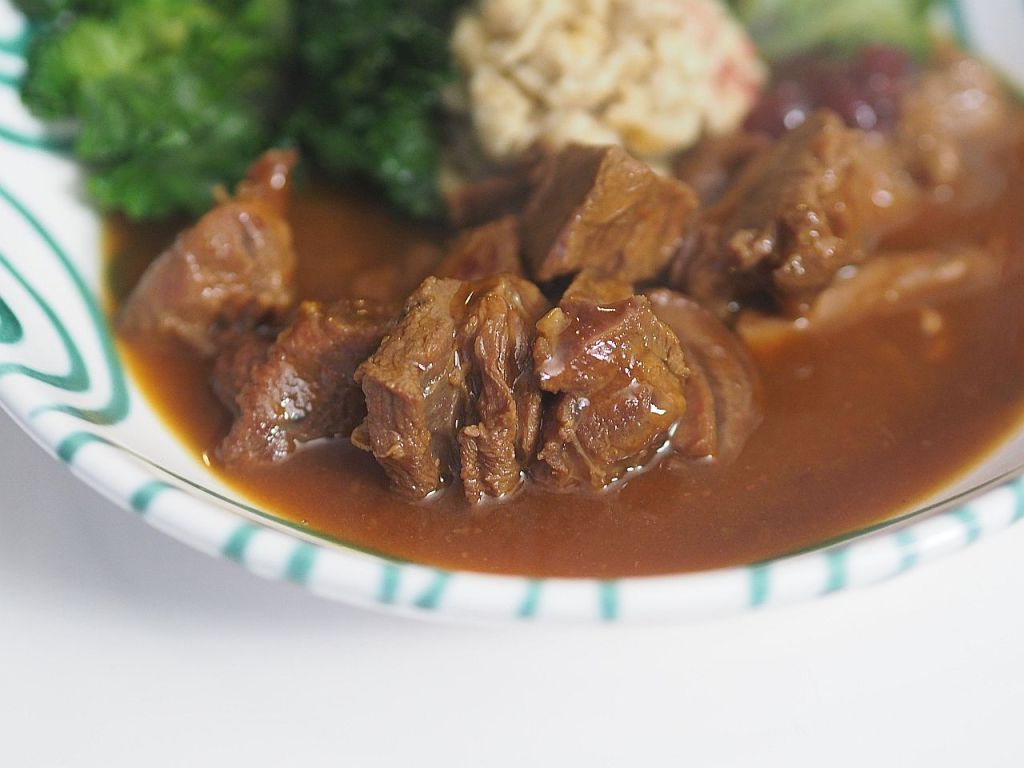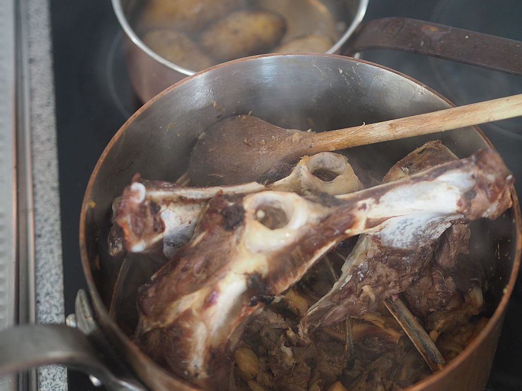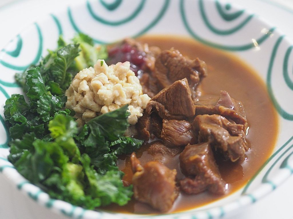 Aus dem Wadfleisch vom Hirschen wurde ein Ragout gemacht. Bei der Zubereitung des Hirschrückens gestern, wurde aus den Knochen und Abschnitten soviel Soße gemacht, daß wir heute ein Ragout haben können. Dazu gibt es Flower Sprouts, einer britischen Züchtung aus Grün- und Rosenkohl. Und Hafer-Spätzle.