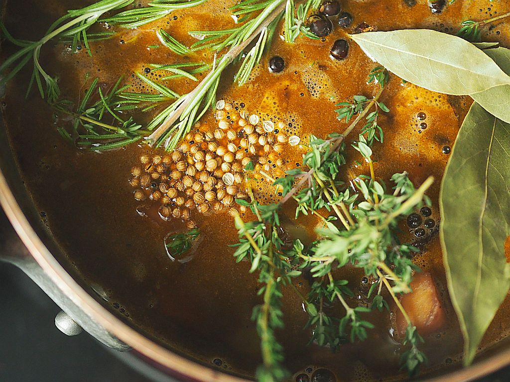 Am Vortag die Grundsoße vorbereiten: Wildknochen im Ofen in einer feuerfesten Form anrösten. In der Zwischenzeit das grob gewürfelte Gemüse und die Wildknochen in Butterschmalz in einer Kupferpfanne anbraten. Soffritto dazugeben und mitrösten. Knochen, wenn sie fertig sind, zum Gemüse geben. und alles nach und nach mit Portwein ablöschen. Mit Gemüsebrühe auffüllen, bis alles bedeckt ist. Lorbeerblatt, Wacholderbeeren, Pfefferkörner, Thymianzweig und Rosmarinzweig dazugeben. Zugedeckt leise köcheln lassen. Nach 2 Stunden abseihen, bis zum nächsten Tag in den Kühlschrank stellen,