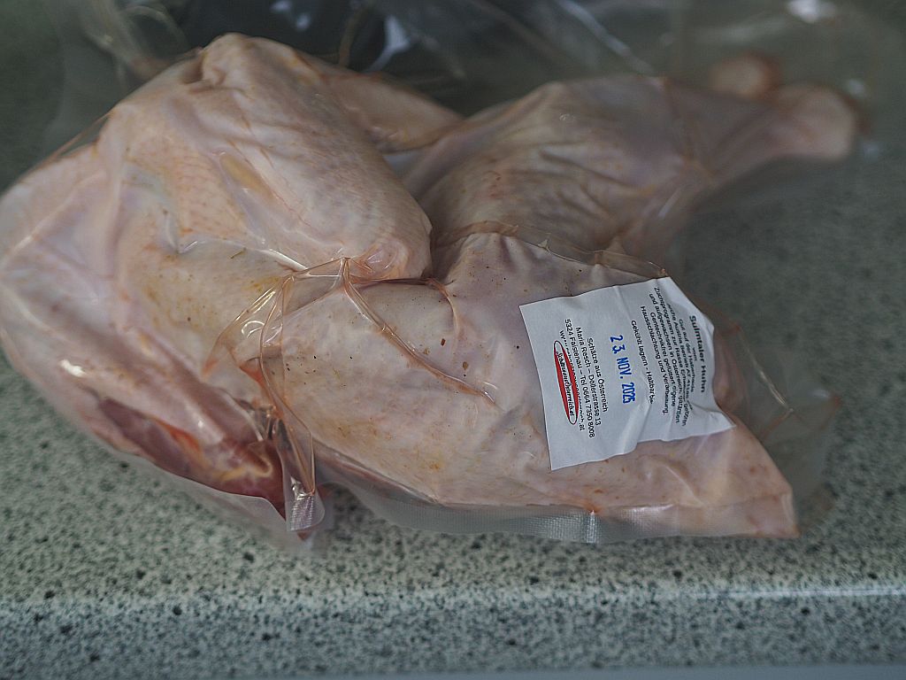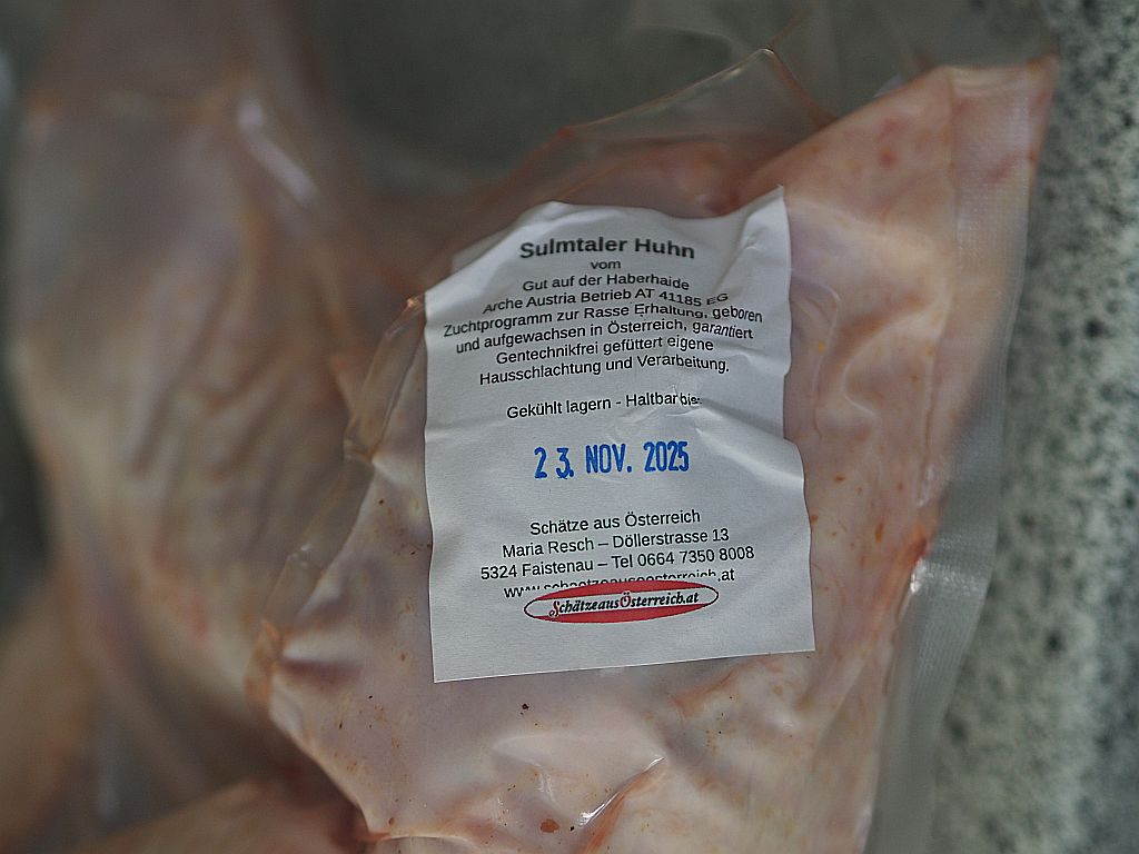 Von April bis November wächst es auf einem Bauernhof heran, es hat ein langes Leben, im Vergleich zum herkömmlichen Masthuhn. Deshalb gibt es das auch nicht das ganze Jahr. Ein solches Huhn, das wirklich auf einem Bauernhof aufgewachsen ist, ist im Supermarkt nicht erhältlich. Das muß man bestellen und man kann lange darauf warten, bis man es bekommt. Doch es hat sich ausgezahlt! Es ist halt was Besonderes, das Sulmtaler Huhn. Unseres kommt vom Gut auf der Haberhaide, einem Arche Austria Betrieb, der ein Zuchtprogramm zur Erhaltung der Rasse am Laufen hat. Das Sulmtaler Huhn wird acht Monate alt, ist zwei Kilo schwer, ein gstandenes Huhn und kein sechs Wochen altes Küken, das im Schnellverfahren gemästet wurde und hierzulande auf dem Grill landet. Je älter ein Huhn, desto gesünder ist es. Für ein Suppenhuhn – der Naturmedizin bei Verkühlung – sollte man 2 Jahre alte Hühner verwenden.