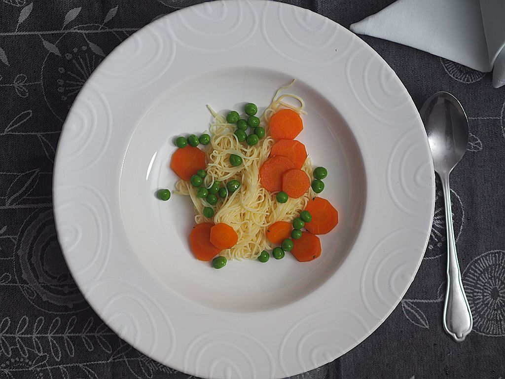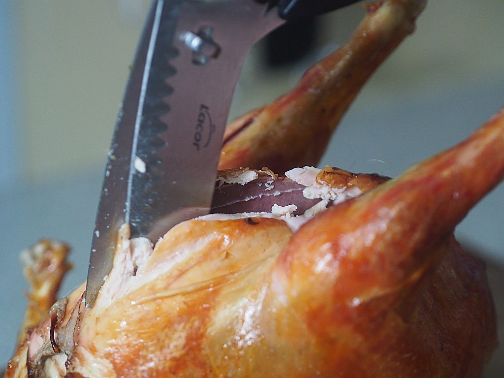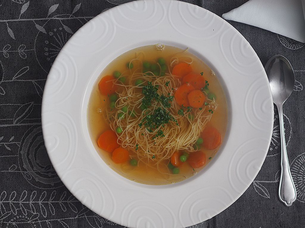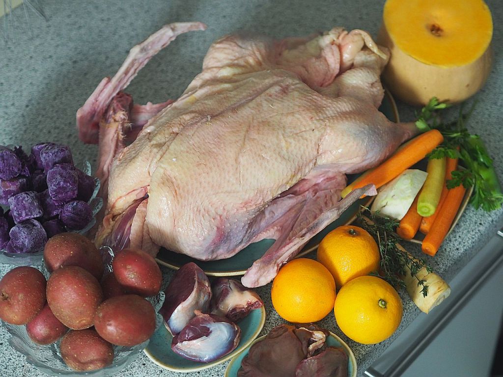 Aus dem langen Halserl wurde eine Suppe gemacht, sowie aus den Flügerln. Keine Innereien, die wurden restlos für die Fülle verwendet. Mit Waldviertler Karotte. Wir haben heute die Waldviertler Lieferung bekommen.