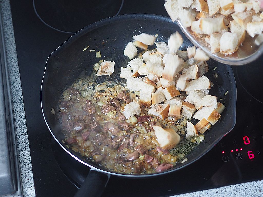 F ü r d i e F ü l l u n g: 3 feingehackte Schalotten, 1 fein gewürfelte Karotte, Petersilwurzel und 1 Stück Sellerie in Butter anbraten. Die klein gewürfelte Leber dazu geben, mitbraten. Salzen und mit einem großen Schluck hausgebranntem Sliwowitz ablöschen. 6 klein gewürfelte Champignons und 4 eingeweichte und gut ausgedrückte fein gewürfelte Morcheln dazugeben, ein paar Min. mitschwitzen, vom Herd nehmen und einen halben Bund feingehackte Petersilie dazugeben. Mit Salz abschmecken.