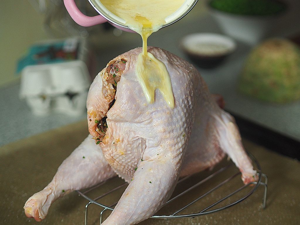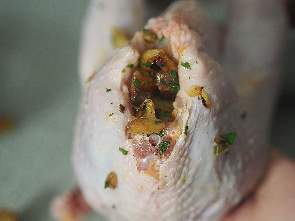 Das Sulmtaler innen salzen. Fülle: 2 Semmeln in Würfeln schneiden, 2 feingehackte Zwiebel in Butter anschwitzen, die klein gewürfelte Hühnerleber, Herz und Magen dazu geben, mit anbraten. Gewürfelte Semel auch in die Pfanne geben, salzen, Muskatnuß dazu, ein bißerl mitbraten, vom Herd ziehen. Ein Ei und einen halben Bund gehackte Petersilie hineinmischen und in das Popschi vom Huhn füllen. Außen salzen und mit heißer Butter übergießen. Bei 160°C ins Backrohr schieben, eineinhalb Stunden.