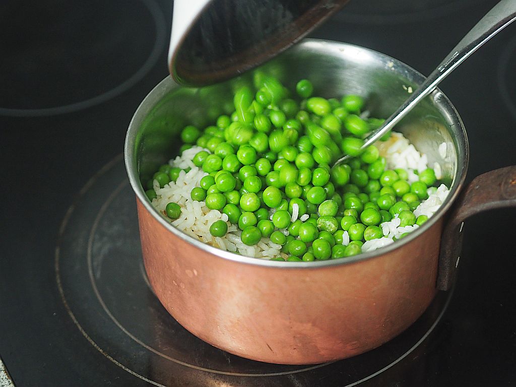 Salzwasser, Butter aufkochen und 1 Tasse österreichischen Reis weichgaren. In der Zwischenzeit 2 mittlere Zwiebeln in Butter anschwitzen. Wenn der Reis fertig ist, den Reis abgießen, abtropfen lassen und zu den angeschwitzten Zwiebeln geben. Abschmecken, Butter dazu geben, umrühren. Kurz vorm Servieren die aufgetauten, nicht gegarten Erbsen einrühren. Nochmal erwärmen.