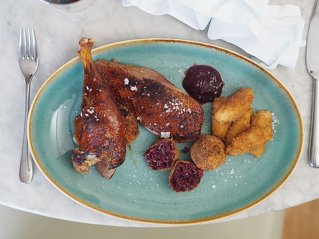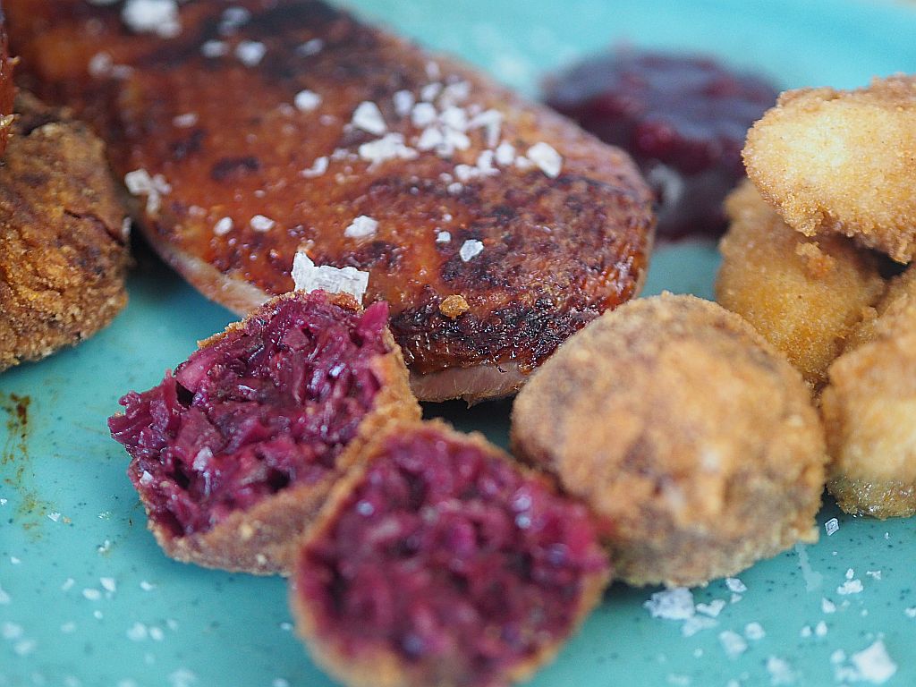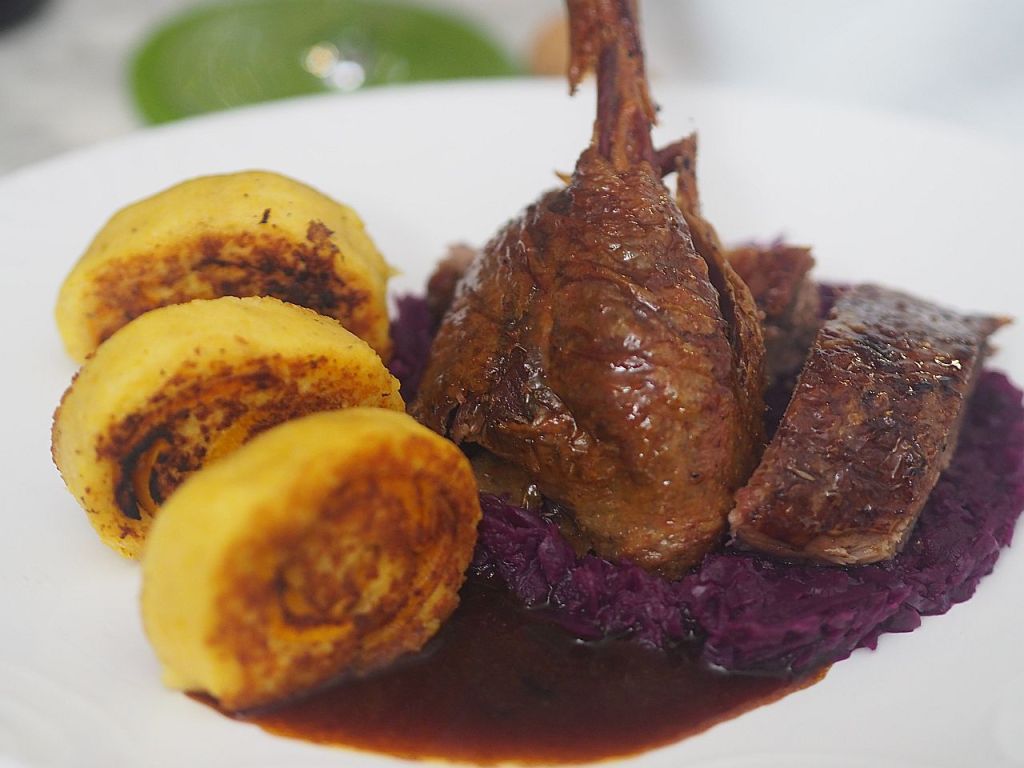 Gebratene Waldviertler Ente mit Rotkrautknödeln, Schupfnudeln und Preiselbeeren.