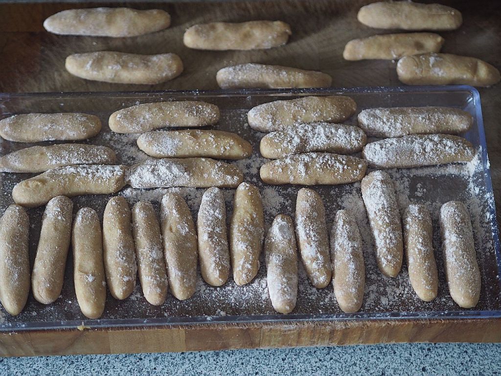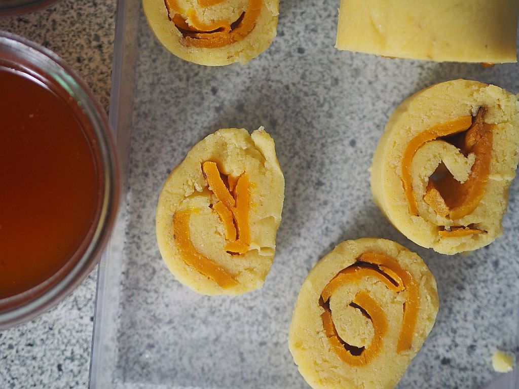 Am Vorabend: Ein ½ kg Erdäpfeln in der Schale weichkochen. Ausdampfeln lassen, schälen und durch die Kartoffelpresse drücken. Ein Ei, Salz, Muskatnuß und erst mal 2 EL Flohsamenschalen dazu geben und gut durchkneten, ziehen lassen. Und wenn noch der Teig zu weich ist fürs Ausrollen, mehr Flohsamenschalen dazu geben. Butterkürbis in dünne Scheiben schneiden, auf ein Backblech legen, und im Backrohr bei 180°C durchgaren. Auskühlen lassen. Den Kartoffelteig auf einer Frischhaltefolie ausrollen, etwa 1 cm dick. Die ausgekühlten Kürbisstücke darauf legen, und etwas salzen, mit Hilfe der Frischhaltefolie zu einer Rolle drehen. Und einwickeln. Im Kühlschrank übernachten lassen.