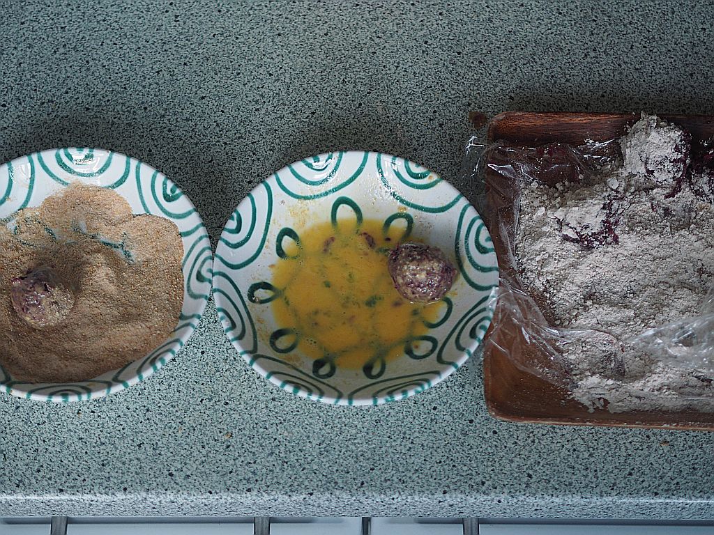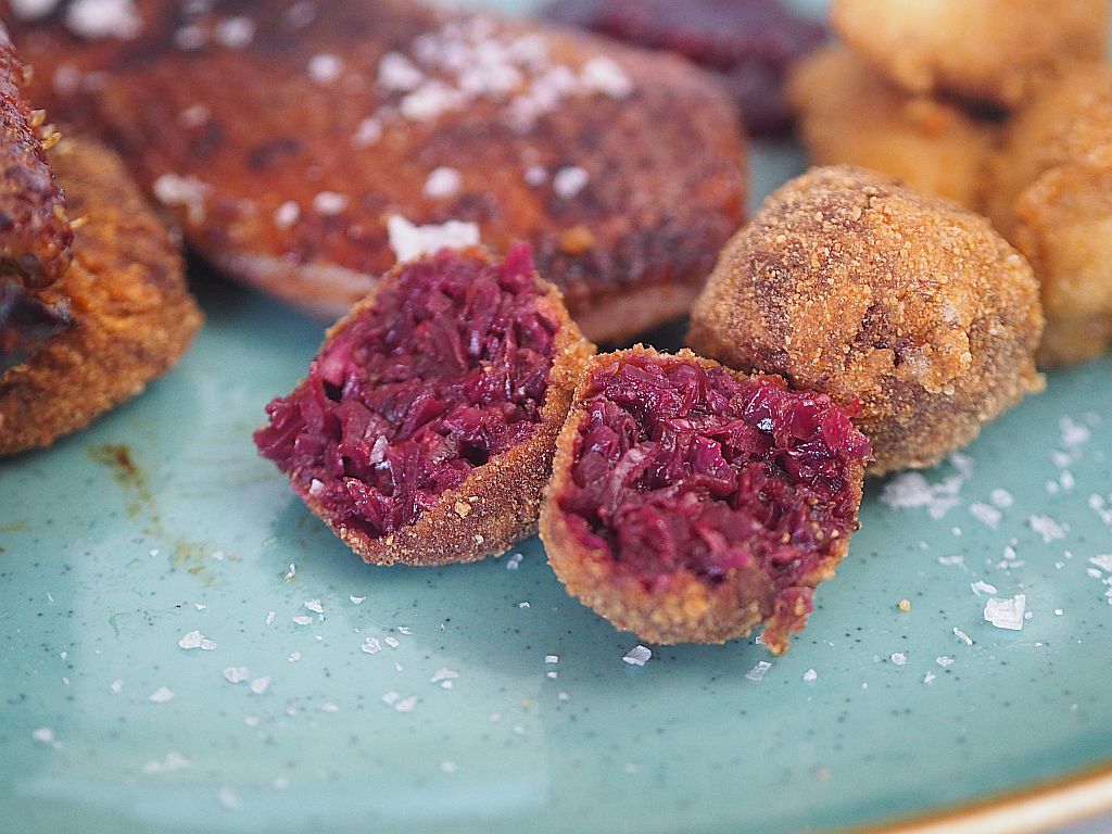Ein halbes Waldviertler Rotkrauthappel fein hobeln. Mit dem Messer noch einmal drübergehen. Eine Waldviertler rote Zwiebel fein hacken, in Butterschmalz anschwitzen. 1 TL Waldviertler Honig dazugeben und karamelisieren. Mit einem Schluck Hopibauer-Essig ablöschen. Das gehobelte Rotkraut beimengen und salzen. Mitschwitzen. 2 Orangen auspressen, zum Rotkraut geben, ein Stück Zimtrinde, Wacholderbeeren 2 Lorbeerblätter und 1 Prise Nelken dazu geben und zugedeckt 20 Min, köcheln lassen. die Flüssigkeit sollte verdampft sein. Vom Herd nehmen. 2 EL Haferkleie einrühren und auf das Fensterbrett stellen, bei Minusgraden auskühlen lassen. MIt der Hand kleine Knödeln formen, dann panieren: zuerst durch Dinkelmehl, dann Ei, abschließend durch Brösel ziehen. Und in heißem Bratolivenöl herausbacken.