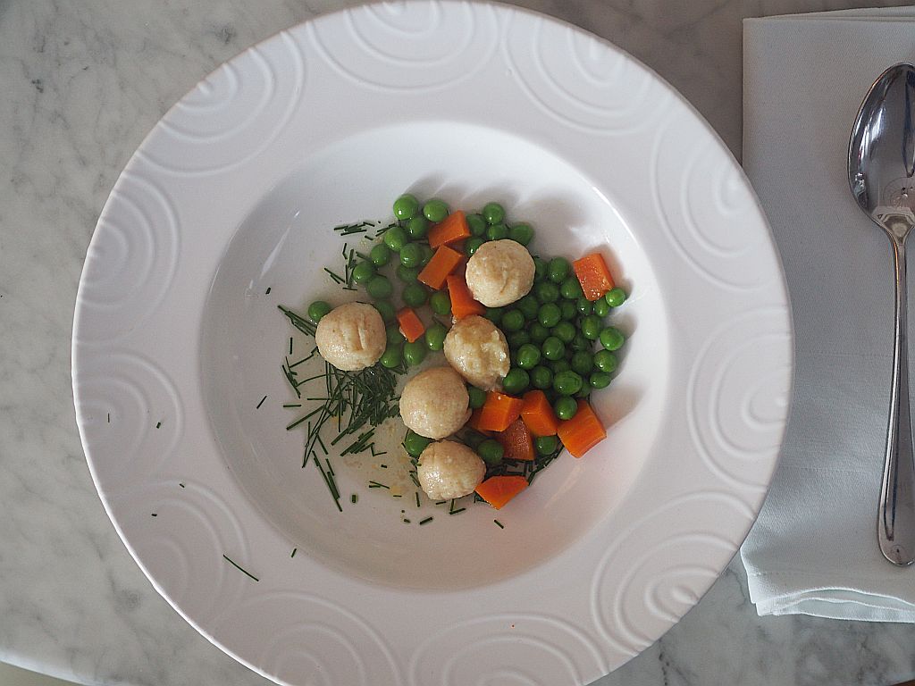 Am nächsten Tag: Salzwasser aufkochen, zurückdrehen und die Haferknödeln hineingleiten lassen und dann nur mehr ziehen lassen, nicht kochen, sonst fallen sie auseinander. In einem Topf eine helle Einbrenn machen mit Butter und Mehl. Die Suppe dazugießen, aufkochen, Schlagobers dazu und kurz köcheln lassen. In der Zwischenzeit die Ganslleber stückeln und in Gänseschmalz anbraten. Die Suppe mit den Haferknödeln, der Gänseleber und den Karotten anrichten, und mit ein bisserl Thymian bestreuen,