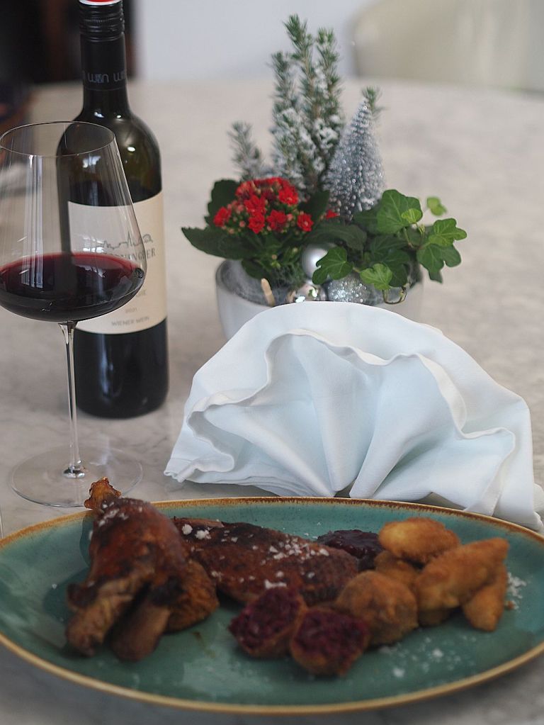 Wein: Wiener Trilogie, 2021, Wieninger, Wien. Sooft Wien und auf dem Etikett ist eine vereinfachte Skyline zu sehen, mit drei Sehenswürdigkeiten: Karlskirche, Stephansdom, Riesenrad. Auch unser Wochenende stand im Zeichen der Zahl Drei. Hiermit beschließen wir diese Trilogie: Schweinsbraten, Sulmtaler Huhn und Ente. Bis zum nächsten Mal. Morgen gibt es wieder etwas Gewöhnliches: Letscho mit Ei. Nächstes Wochenende haben wir schon den 1. Advent! Was wird es geben? Und schaffen wir es am Samstag zum Wochenmarkt in Bad Vöslau? Oder muß das einem Christkindlmarkt weichen? Oder kann man das verbinden? Und wird es wieder Schnee geben? Letzte Nacht hat’s obigschneit.