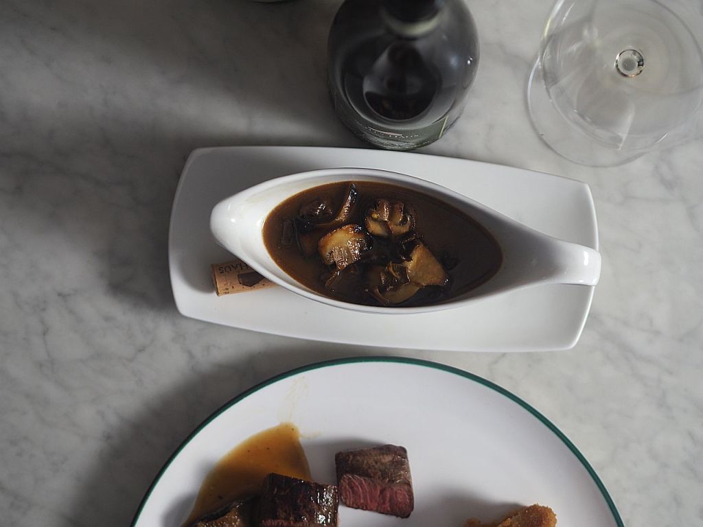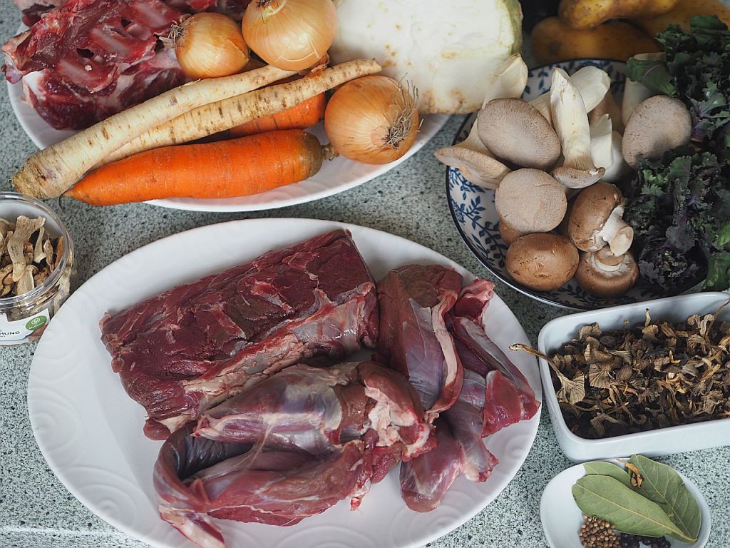 S o ß e Die Wildknochen auf ein mit Backpapier belegtes Blech ausbreiten und bei zirka 200°C anrösten. Achtung! Vorsichtig kontrollieren, ob es verbrennt gegebenenfalls zurückdrehen. 4 gehackte Zwiebel, 2 grob gehackte Peterwurzeln, 1 Karotte, 1 gehackten halben Knollensellerie in einer Oliven-Butter-Mischung im großen Topf anrösten. In der Zwischenzeit den Hirschrücken und die das Gulaschfleisch parieren, die Abschnitte gleich zum Gemüse geben und mitanbraten. Die angebratenen Knochen aus dem Ofen nehmen, in den Topf geben, mit Noilly Prat ablöschen und mit Hühnerbrühe auffüllen, sodaß die Knochen bedeckt sind. 3 Lorbeerblatt, Korianderkörner, Wacholder, Pfeffer und Salz dazu geben. 4 Stunden köcheln lassen. Wenn fertig, abgießen, das Fett mit der Trennkanne abtrennen, die Hälfte der Soße in den Kühlschrank für das Wildragout morgen geben. Die getrockneten gemischten Pilze und die Eierschwammerl (Pfifferlinge) in heißes Wasser einlegen, die gemischten Pilze abgießen, die Flüssigkeit auffangen, zur Wildsoße geben. Die Pilze feinhacken und zur Soße geben. 1 Viertelstunde einköcheln. In der Zwischenzeit halbierte Kräuterseitlinge und Champignons ohne Fett in der Pfanne beidseitig anbraten. Die Wildsoße durch ein Sieb zu den angebratenen Kräuterseitlingen und Champignons dazugeben. Ebenfalls die eingelegte Eierschwammerl inklusive Flüssigkeit dazugeben. Und nochmal einköcheln. Vor dem Servieren binden.