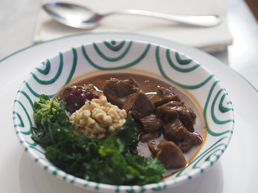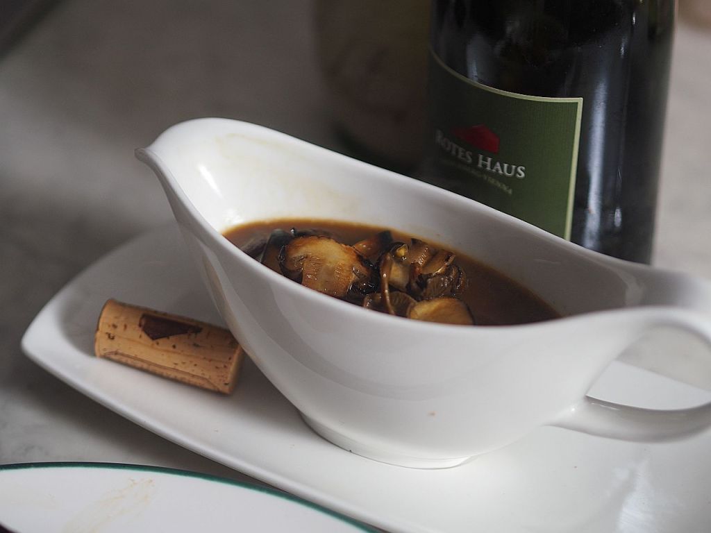 Das erste Wildessen in dieser Jahreszeit: ein zartes Rehragout vermischt mit Eierschwammerl (Pfifferlinge), getränkt in einer Rotweinsoße mit Wildknochen, die am Vortag geröstet wurden, herrlich zum Auftunken mit den Schupfnudeln. Davor eine gehaltvolle Steinpilzsuppe, die den Bauch vorwärmt und danach ein Zwetschken-Nuß-Crumble. Beim Gamsbart des Großen Jägers, das läßt frohlocken und hoffen, daß es davon noch mehr geben wird.