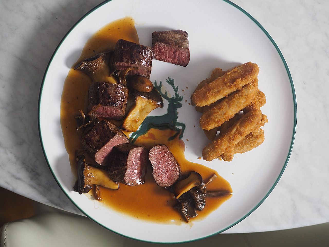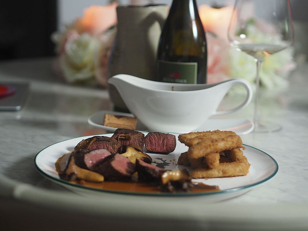 Hirschrücken rundum anbraten, bei 80 °C im Backrohr durchziehen lassen.