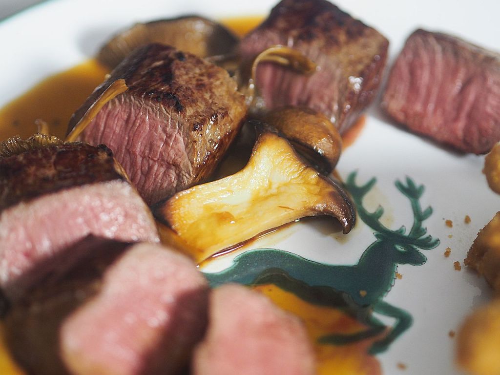 Ein Hirschrücken ist so ziemlich das Edelste, was es gibt! Das Rotwild, ein Damhirsch, wurde frisch erlegt im Waldviertel. Für die Soße haben wir Hirschknochen bekommen, in prächtiger Größe und stattlicher Anzahl. So stand dem nichts im Wege, eines der besten Waldgerichte herzustellen; – hiernieden auf Erden, an diesem 2. Adventsonntag: Damhirschrücken mit Pilzsoße und Wuzlnudln. Der Rücken, so zart wie ein Filet, wie es nur vom Wild sein kann; dazu Pilze in einer Soße aus den Wildknochen, und die Wuzinudeln in Bröseln, zum Auftunken, das ergibt eine herrliche Kombination, da zeigt sich der Wald von seiner schönsten Seite! Ein herzliches Dankeschön und Grüßgott ins Waldviertel.